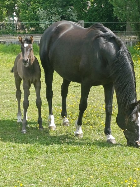Kayenne, eine Tochter von De Niro und tragend von Total PS, hat bei uns bereits 4 wunderschöne Fohlen gehabt. Eines wurde nach Schweiz verkauft, ein anderes über die Auktion nach Katar, das dritte wurde nach Belgien verkauft und das vierte Fohlen geht in diesem Jahr zu einer Amazone in Friesland, die mit ihm das höhere Arbeiten reiten möchte. Sie hat mit 3 Jahren eine Sehnenverletzung erlitten bei der Person, von der ich sie gekauft habe. Dies geschah beim Anreiten, und seitdem lahmt diese wunderschön gebaute Stute. Dies ist eine hervorragende Zuchtstute, die sehr schöne Fohlen züchtet, von denen zwei auf den Fotos zu sehen sind. Weitere Fotos und Videos kann ich über WhatsApp zusenden. Sie ist im Umgang unkompliziert, aber beim Fohlengebären ist sie sehr beschützerisch und eine echte Mutter für das Fohlen.