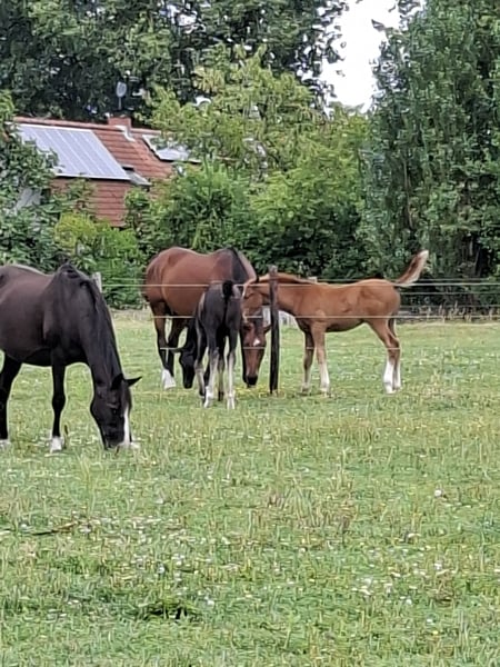 Kayenne, une fille de De Niro mais actuellement non gestante, a déjà eu 4 magnifiques poulains chez nous. 1 a été vendu en Suisse, le 2ème par le biais de la vente aux enchères au Qatar, un 3ème a été vendu en Belgique et le 4ème poulain de cette année ira à une cavalière en Frise qui souhaite le monter dans des disciplines plus avancées. Elle a subi une blessure au tendon à l'âge de 3 ans chez la personne chez qui je l'ai achetée. Cela s'est produit lors de son débourrage et depuis, cette jument magnifiquement construite boite. C'est une magnifique jument de reproduction qui produit de très beaux poulains, dont 2 apparaissent sur les photos. Je peux envoyer plus de photos et de vidéos par WhatsApp. Facile à manipuler, mais elle est très protectrice lors du poulinage, tout en étant une véritable mère pour le poulain.