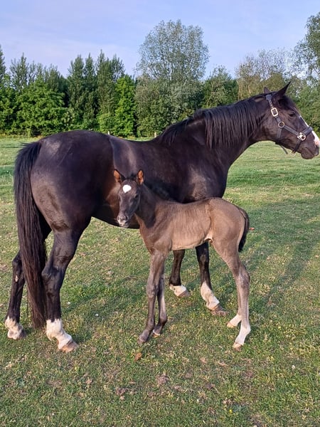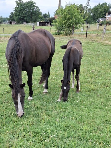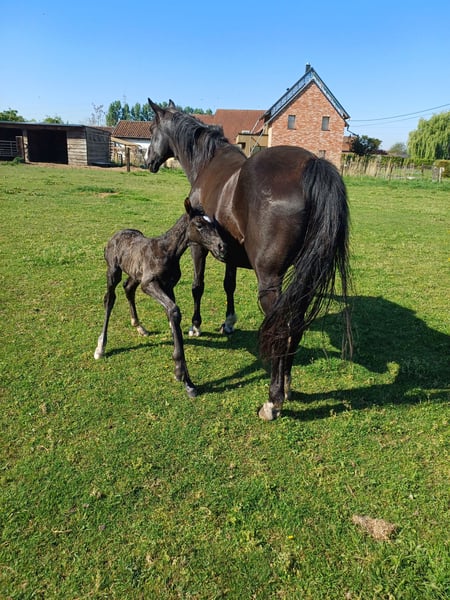 Kayenne, a daughter of De Niro and pregnant by Total PS, has already had 4 beautiful foals with us. One was sold to Switzerland, the second through the auction to Qatar, the third was sold to Belgium, and the fourth foal this year is going to a rider in Friesland who wants to compete at a higher level with her. She sustained a tendon injury at the age of 3 with the person from whom I bought her. This happened during the breaking-in process, and since then, this beautifully built mare has been lame. She is a stunning breeding mare that produces very nice foals, two of which are in the photos. I can send more photos and videos via WhatsApp. She is easy to handle, but she is very protective when foaling and a true mother to her foal.