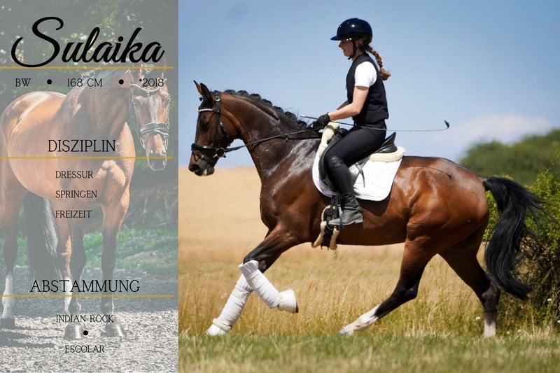 Sulaika ist eine 2018 geborene BWP Stute ca. 168 cm v. Indian Rock, Apache; Vivaldi x Escolar, World Cup *Sulaika* ist eine bildschöne und super coole Stute. Sie bringt 3 übermäßig gute GGA mit, ist dabei aber super zu sitzen und leicht in die Anlehnung zu reiten. Sie ist vom Gemüt ruhig und lässt sich eher anschieben, als das man halten muss. Sie eignet sich auch super für Jugendliche oder als Umsteigerpferd. Sie geht mehr als gerne ins Wasser und ist absolut toll im Gelände zu reiten. Sie ist unerschrocken und macht sehr viel Freude !!! SCHAUEN SIE SICH UNBEDINGT IHR VIDEO AN !!! Ein Pferd das in jedem Viereck glänzt und mit dem man ebenso die Seele im Gelände baumeln lassen kann. Im Umgang super unkompliziert und schmusig, genießt es umsorgt zu werden. Ein aktuelles Video finden Sie hier in der Anzeige oder unter folgendem Link: https://www.youtube.com/watch?v=iKvFv2l33xM Pferdehandlung Dederichs – Ihr Partner für den Pferdekauf Kontakt & Erreichbarkeit: Anfragen bitte ausschließlich telefonisch unter 0173/9792139 Montag – Freitag: 09:00 – 18:00 Uhr Samstag: 09:00 – 15:00 Uhr Sonntag: Ruhetag Folgen Sie uns auf Social Media! Erleben Sie unseren Alltag mit den Verkaufspferden auf Instagram, TikTok & Facebook unter Pferdehandlung Dederichs Rabatt: Bei sofortiger Mitnahme Ihres neuen Traumpferdes erhalten Sie zwischen 5 %– 10 % Rabatt Probereiten & Vorführen: • Probereiten: 30 € pro Pferd (max. 2 Reiter), Betrag wird beim Kauf angerechnet • Feiertage: Proberitt 50 € • Vorführung durch unsere Bereiter: 25 € pro Pferd (Vorreiten, Bodenarbeit etc.) Ankaufsuntersuchung & Transport: • Viele unserer Pferde besitzen bereits eine AKU • Sie können selbstverständlich Ihren eigenen Tierarzt mitbringen • Gerne organisieren wir eine Untersuchung • Wir unterstützen Sie auch gerne beim Transport ins neue Zuhause Weitere Verkaufspferde: In unserem Stall stehen weitere Verkaufspferde, die noch nicht online sind. Falls Ihr Traumpferd noch nicht dabei ist, zögern Sie nicht, uns zu kontaktieren. Wichtige Hinweise: • Stockmaß-Angaben sind geschätzt und nicht exakt nachgemessen • Alle Beschreibungen sind subjektive Einschätzungen des Verkäufers und keine zugesicherten Eigenschaften Weitere Informationen finden Sie unter: www.Pferdehandlung-Dederichs.de