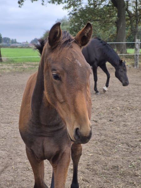 Chique merrieveulen van Feromas van Beek Z × Langata Son op zoek naar een 5* huisje. Geboren 22/04/2025. Charming Sass K, is een correct gebouwd, ruim bewegend merrieveulen. Ze is heel mensgericht en veelzijdig aangelegd. Leuk voor de recreatieve ruiter maar gaat zeker ook geschikt zijn voor een meer ambitieuze ruiter. Charlie is al meegeweest naar 2 veulenkeuringen, hier heeft ze zich netjes gedragen en haalde ze leuke scores. Ze kent het volledige veulen ABC, geeft netjes haar voetjes, ook de hoefsmid is geen probleem. Kent transport en loopt hier zo op, kent de wasplaats en afspoelen, loopt netjes mee aan het halster. Kortom een veelzijdig veulen voor zowel sport als fokkerij. Laatste 3 foto's zijn half broers en half zus uit dezelfde moeder. Filmpje is tevens de half broer uit dezelfde moeder. Stuk voor stuk paarden met voldoende kwaliteit en top karakter, alle 3 nog in mijn bezit, dus zijn ook te bezichtigen. Charlie staat momenteel nog met mama op de weide, komt binnekort binnen en wordt dan gespeend. Ook worden er dan nog nieuwe filmpjes gemaakt, komen bezichtigen kan uiteraard altijd. Verwacht wordt dat ze uitgroeit tot een fijn all round damespaardje rond de 168cm Meer info via Whatsapp 0472706974 Meer info 0471 19 93 53