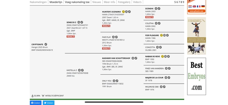 over zijn mama kashmir van schuttershof x major de la cour Het veulen kashmir van schuttershof x Senecio Z For Sale: Cryponite (07/04/2025) (Hengste-Veulen) Mama: Kastella Z (15/04/2008) (H: 1m68) Spr: 1,20m-1,m30 Bloedlijn : - (M) Kashmir V Schutter (SBS K28286) - (F) Only You (BWP 115832) Papa: Senecio Z (07/05/2021) (H: 1.70) Spr: 1 m oplopend Papa van Senecio - (M) Hunters Scendro (HANN 276431316559307) Spr: 1,40m. mama van Senecio - (F) Fair Play VD Heffinck (WESTF 276441410578512) Spr: 1,50m. Mama: Kastella Z; Kastella Z heeft als 6 Jarige Merrie bij de jonge paarden proeven gelopen v 1,20m. Met finales 1,25m.-1,30m. (+-2014) Dit onder het zadel van Grégory Wathelet en Jérôme Guery. Heeft erna nog in ammateurconcours meegedaan en omwille v haar Bloedlijn in de fokkerij geplaatst. Waarbij ze alreeds 6 Veulens heeft voortgebracht en dat met de grootste Zorg voor haar Veulens. Papa: Senecio Z; Als 4 Jarig Toptalent Combineet zijn goede Springgenen met zijn athletich Model, lichtvoetige galop en meer dan voldoende Springaanleg. zijn papa is een hengst die goed in het rechthoekmodel staat. Hij beschikt over goede basisgangen met als beste gang zijn gebalanceerde galoppade. Op de sprong zien we dan ook de snelheid en het vermogen van wat een modern sportpaard nodig heeft. Onder het zadel is hij verstandig en beschikt over een goede verhouding van bloed en werklust. cryptonite: Hij is een heel sociaal veulen en houdt van knuffelen en heel veel aandacht. hij geeft zonder probleem zijn voeten voor zijn hoeven bij te vijlen. Hij is gescheiden van zijn mama