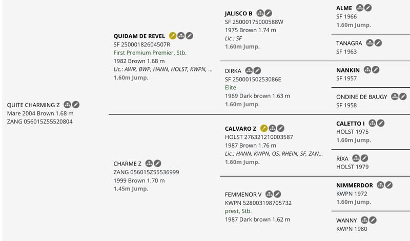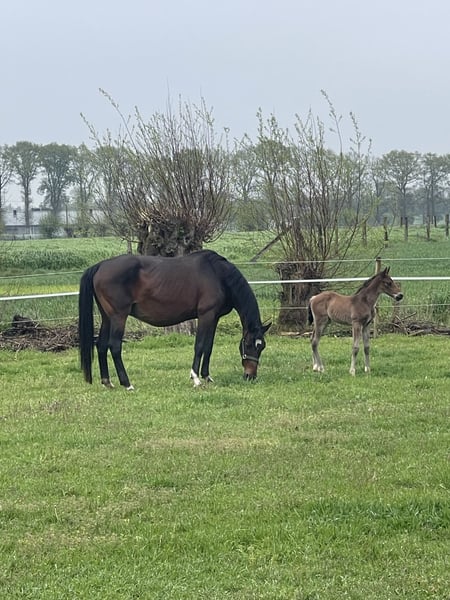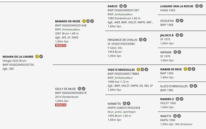 BWP stamboek hengstenveulen met indrukwekkend pedigree .( zie foto’s) Uitmuntend bewegen en mooie uitstraling springgefokt veulen geboren 12 april . De moeder : Quidam de Revel x Calvaro x Nimmerdor ( 3 generaties die op het hoogste level presteerden en veel internationale sportpaarden vererfden . De grootmoeder is Charme Z die zelf op L 1.50 actief was onder Benjamin Meredith in de USA en is tevens ook de volle zus van Royal Discovery die onder Markus Beerbaum glansrijk deelnam aan de Olympische spelen. 3 de moeder is Femmenor die ook verschillende internationale sportpaarden heeft ter wereld gebracht . Vader (laatste foto )is de jonge hengst Wuhan de la Linéaire zoon van grandprix hengst Bamako de Muze en Oilily de Muze L 1.60 o Koen Vereecke . Wuhan presteerde super met fantastische uitstraling op,de BWP-4 jarige stallioncompetitie en wist me toen meteen te overtuigen . Kortom een toekomstig goede investering voor de sport/ fokkerij Ps De moeder van dit hengstje ( fantastische fokmerrie in topconditie )is ook te koop en wordt op einde van de maand opnieuw gedekt .