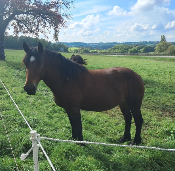 Aurora Viola ist eine 3 1/2-jährige braune Schwarzwälder Kaltblutstute. Sie stammt ab vom Leistungshengst Vinzent (V: E.H. LH Vento; MV: LH Wildfuchs) aus der braunen Staatsprämien- und Leistungsstute Alice (V: LH Leonhard; MV: HPH LH Donnergroll). Seit November 2025 ist Aurora aufgestallt und hat Ihre Ausbildung zum Reitpferd begonnen. Im Umgang noch jugendlich, zeigt sie sich unterm Sattel stabil und sehr unerschrocken. Sie hat einen guten raumgreifenden Schritt und einen sehr bequemen und lockeren Trab. Sie misst zurzeit ca. 1.55m und steht noch in der Entwicklung. Aurora ist PSSM N/N. Sie hat die Farballele AaEe und trägt somit das begehrte Rappgen in sich. Für die Zuchtinteressierten von Bedeutung: Aurora Viola stammt aus einer stark gefährdeten Stutenfamilie ab (Stutenfamilie der Arnika). Für Aurora suche ich ein neues Zuhause mit Familien Anschluss. Sie wird sicherlich ein sehr arbeitswilliges, motiviertes und freudiges Arbeitspferd werden. Aufgrund ihres jungen Alters sollte Erfahrung mit Jungpferden und der Pferdeausbildung vorhanden sein. Keine Händler und keine Reitschulbetriebe! Für weitere Infos/Bilder/Videos nehmt gerne direkt Kontakt mit mir auf.