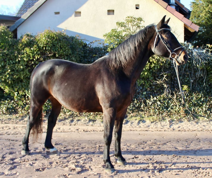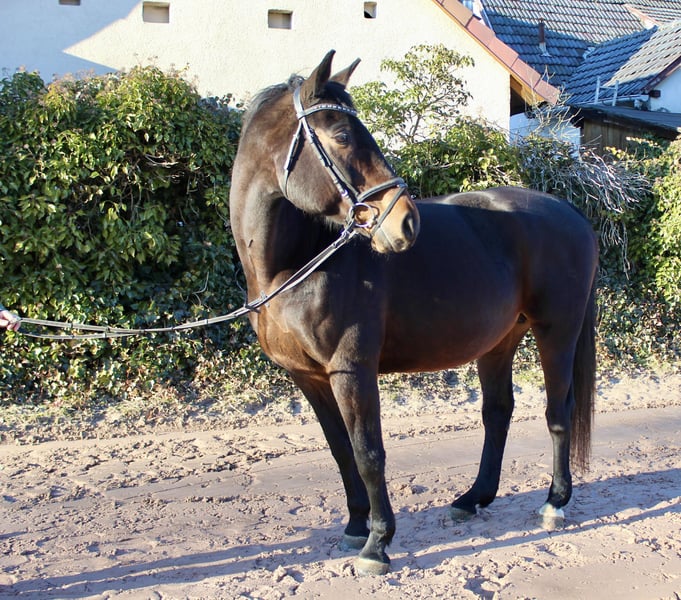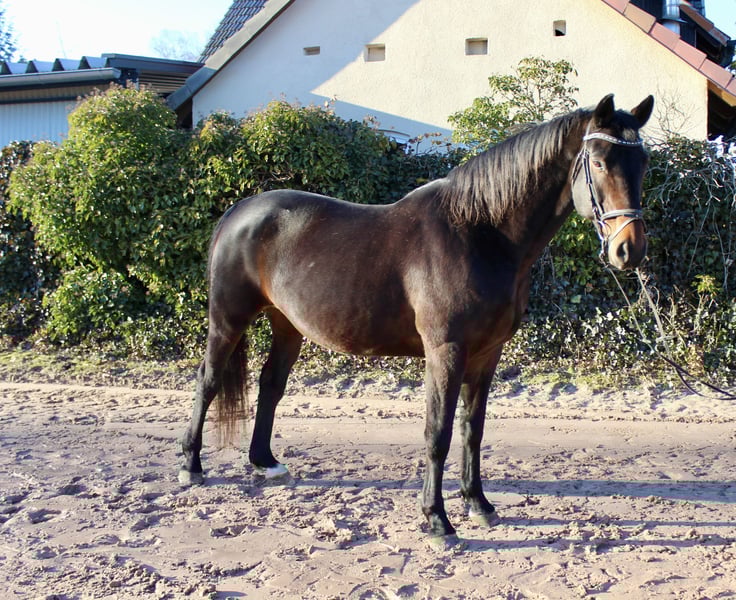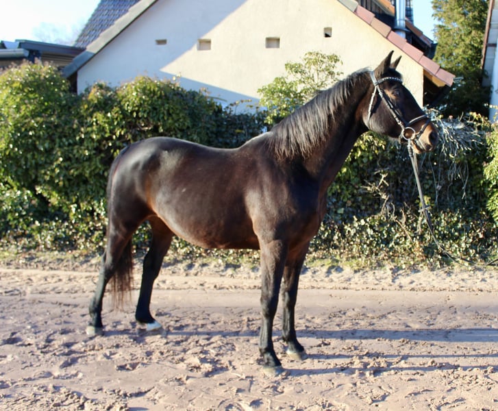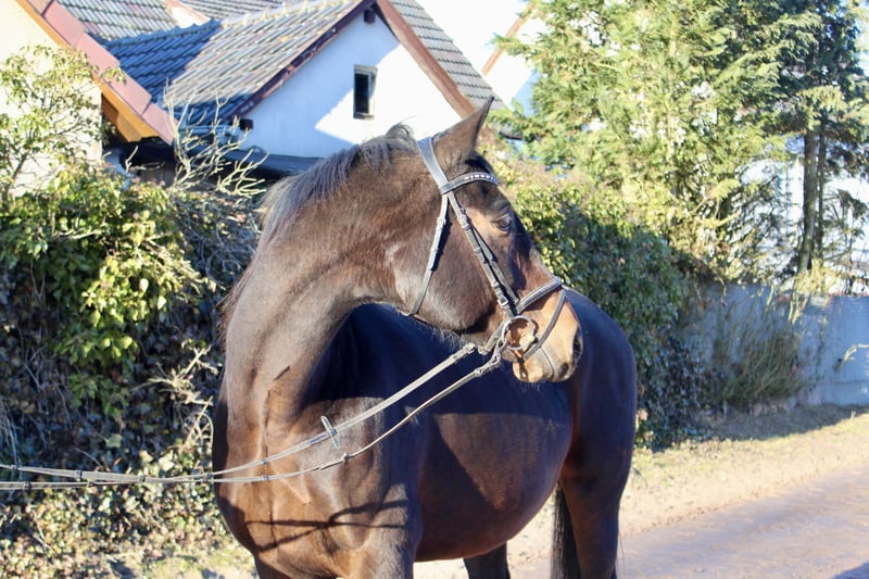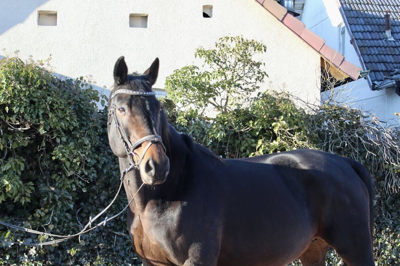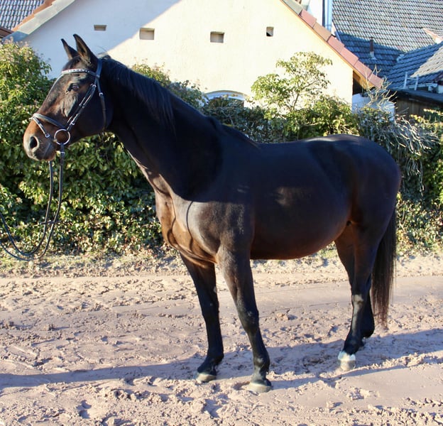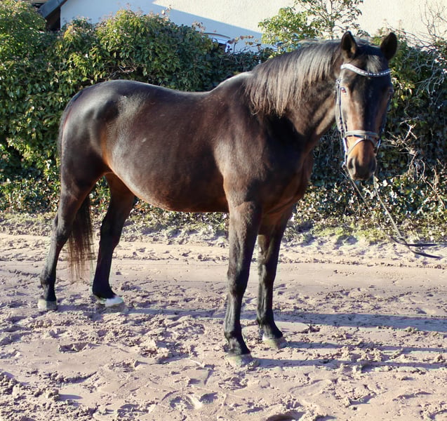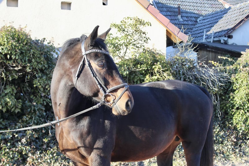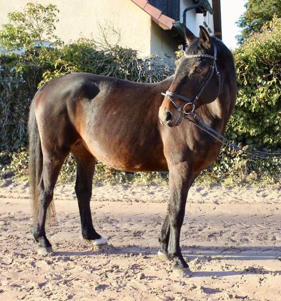 Gloria – a lovely mare with excellent bloodlines! Gloria is a beautiful dark bay Oldenburg mare, born in 2011, approximately 16.1 hh. She is not only very elegant but also possesses a wonderful temperament. Whether riding, grooming, leading, or handling – Gloria always wants to please! She is straightforward, gentle, very people-oriented, and eager to impress. She is comfortable and well-schooled under saddle, moves softly through the back, and is a reliable partner with good gaits – also calm and brave in the terrain, whether alone or in a group. She is regularly vaccinated and dewormed. Gloria is familiar with lunging, free jumping, ground work, indoor and outdoor schooling, as well as long trail rides. She has already produced several foals, some of which compete in show jumping up to 1.40 m! Overall, a fantastic horse that can be a unique partner for leisure riding and/or breeding! She is back in work after foaling and takes it well. Not a beginner’s horse, but suitable for riders at E-N level. Her pedigree is also impressive: Sire: Sandro Boy by Sandro Dam: by Landadel out of Glander Price: €6,500. She is located near Sonnefeld, 96242. Transport can be arranged at the buyer’s expense. Gloria is being sold due to herd reduction.