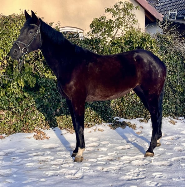 Galina - Elegant mare with potential! Galina is a very stylish black mare, born in 2018, approximately 16.1 hh. Not only is she very attractive, but she also has an excellent temperament. She has been ridden mainly for leisure and has had one foal; she is now back in work. She responds well to lunging, is impeccable in handling, and gets along well in a herd. Galina needs a gentle yet assertive rider. Once you win her heart, she becomes a wonderful partner. She is barefoot and dewormed. She is familiar with lunging, ground work, and training in the indoor arena and on the outdoor riding surface. Due to her foal, she is naturally a bit "green" in her training and now needs someone to further develop her potential. Galina has great potential, and there is much to achieve with her! Sire: Gustav v. Gambrinus Dam: v. Checkland Price: €5,950. She is located near Sonnefeld, 96242. Transportation can be arranged at the buyer's expense. Gloria is being sold due to reduction of stock.