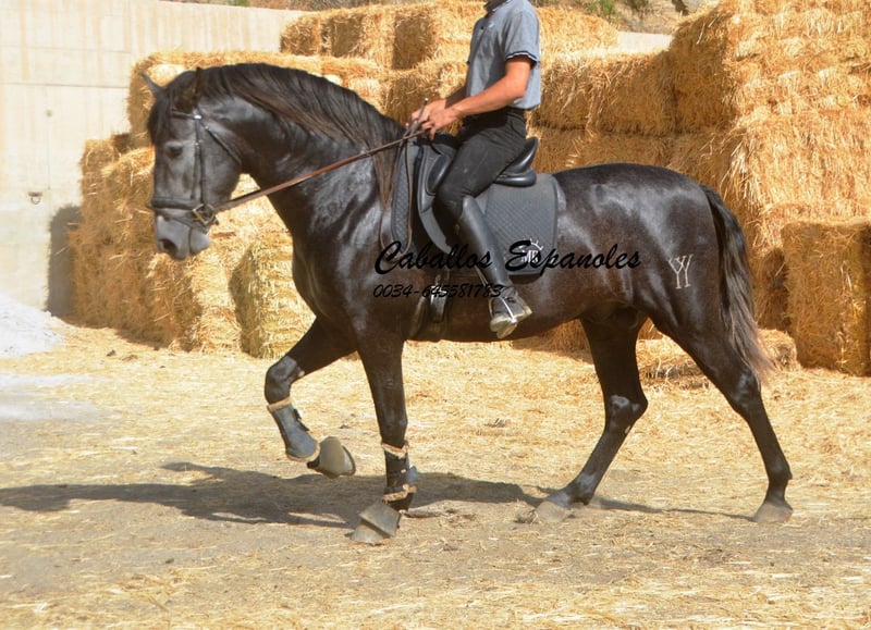 Deze barokke PRE hengst is een echte blikvanger, met een mooi hoofd en een indrukwekkende hals. Hij is braaf in de omgang en heeft geen problemen met andere paarden. De jonge hengst beschikt over drie goede basisgangen. Inmiddels wordt hij zonder longe gereden en toont hij al een goede balans. De hengst, afkomstig van stal Yedra, is ook al eens in het terrein geweest. Tijdens het werken op de piste werkt hij graag mee en is hij geconcentreerd op de ruiter. Een indrukwekkende PRE die in elke discipline zijn ruiter zal plezieren. Het paard wordt in opdracht verkocht. Hij kan bij ons nog in training blijven. Een keuring wordt op korte termijn geregeld. Internationaal transport mogelijk.
