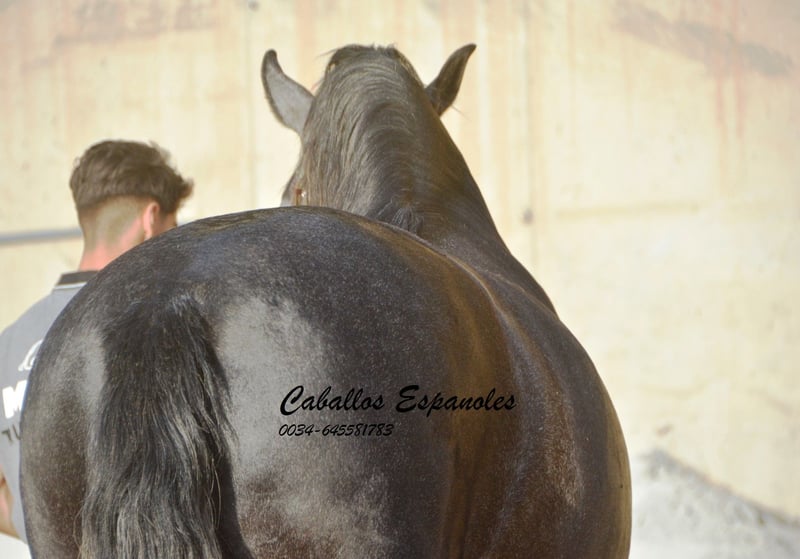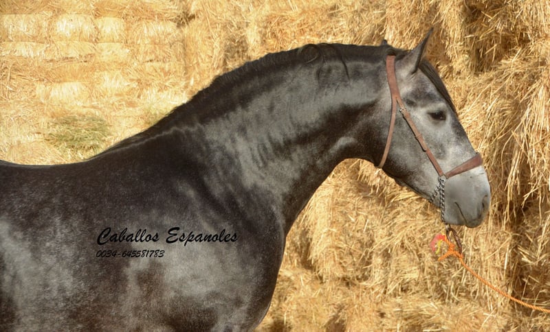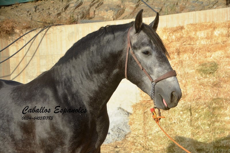 Este semental PRE de estilo barroco es un espectáculo, con una cabeza bonita y un cuello prominente. Es dócil en su manejo y no tiene problema alguno con otros caballos. Este joven cuenta con tres buenos aires básicos y actualmente se monta sin riendas largas, mostrando ya bastante equilibrio. El semental, procedente de la ganadería Yedra, también ha salido al campo en alguna ocasión. En la pista, trabaja con gusto y está atento al jinete. Un impresionante PRE que seguramente deleitará a su jinete en cualquier disciplina. El caballo se vende por encargo. Puede quedarse con nosotros en preparación si se desea. Se organizará una revisión veterinaria en breve. Transporte internacional disponible.