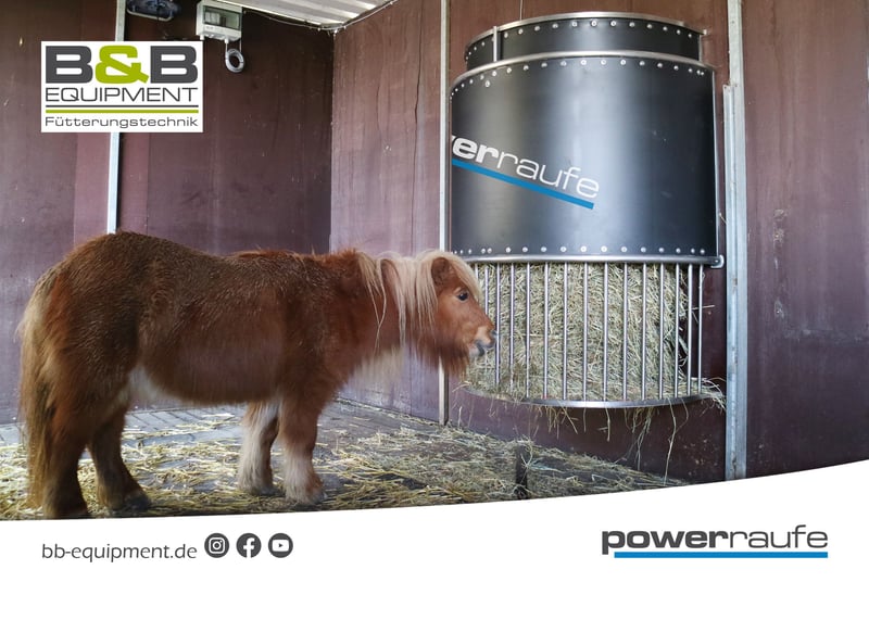 Guten Tag, wir bieten die zeitgesteuerte automatische Heuraufe aus Edelstahl an. Mit der powerraufe können Sie Ihr Pferd 24/7 zeitgesteuert automatisch füttern, ohne dabei in Stress zu geraten. Mit der powerraufe in ½ halbrund oder rund ist das gar kein Problem. Die powerraufe aus Edelstahl ermöglicht es Ihnen, ihr Pferd in der Offenstall- oder in der Boxenhaltung über 24/7 verteilt mit kleinen gesunden Heurationen zu versorgen. Die Zeiten legen Sie selber spielend leicht per Tasten oder via App im Bluetooth Bereich fest. Sie selbst bestimmen wie lange Ihre Pferde Zugang zum Heu haben. Die powerraufe, die Heuraufe zeitgesteuerte Heuraufe hat ein Fassungsvermögen je (½ halbrund) von 12-15kg aufgelockerten Heu. Zudem kann die Heuraufe optional mit einer eingebauten Heubefeuchtung ausgestattet werden. So können Sie zeitgesteuert und effektiv gegen Heustaub und Pferdehusten vorbeugen. Betrieben werden kann die powerraufe im Netzbetrieb oder im AkkuSolar Betrieb. Unsere Raufen sind absolut wetterfest und können ruhig im Außenbereich stehen. Die powerraufen, die Heuraufe werden ganz gleich ob Rundraufe oder ½ Rundraufe, komplett montiert und bereits einsatzbereit auf einer Europalette zu Ihnen geliefert. Bei Fragen senden Sie uns gerne eine Nachricht oder rufen Sie uns an, wir stehen Ihnen gerne jederzeit zur Verfügung. B&B equipment GmbH Made in Germany