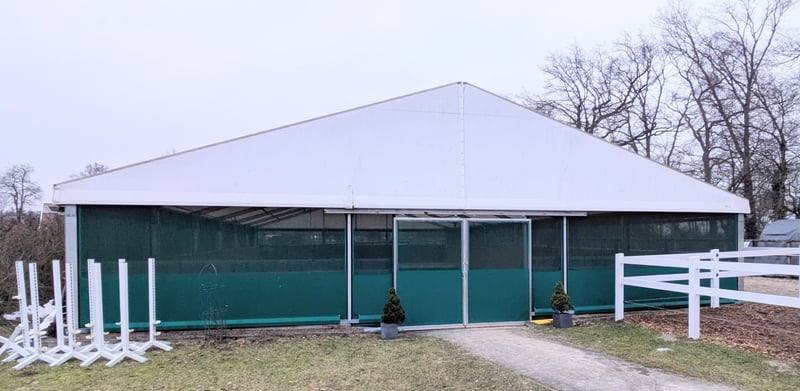**Seltene Gelegenheit** Wir verkaufen unsere Zelthalle! Die Zeltkonstruktion selbst kann unterschiedlich eingesetzt werden, wir haben diese als temporäre Reithalle benutzt. Das Zelt hat die Masse 15 x 30 m, Hersteller: Spantec, Modell Favorit. Es wurde 2019 aufgestellt. Das Zelt ist in sehr gutem Zustand, das Dach ist aus PVC-beschichtetem Gewebe (650g/m2, UV-beständig, lichtdurchlässig & schwer entflammbar), die Seiten bestehen im unteren Teil aus PVC Plane und Windschutznetzen, die Träger sind aus Aluminium. Verankerung via Erdnägeln. Die vorhandenen 7 LED Lichtleisten geben wir im Preis inklusive mit. Aktuell ist eine Bowe-Beregnungsanlage für den darunter liegenden Reitplatz installiert, welche bei Bedarf mit gekauft werden kann (nicht inklusive im Preis). Besichtigung vor Ort selbstverständlich möglich.