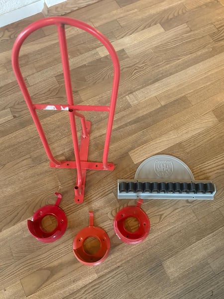 Hier ein Set an Halterungen für den Sattelschrank, darunter 3 Halterungen für diverse Halfter oder Trensen, eine Gertenhalterung, eine Halterung für den Sattel. Lange genutzt, aber in gutem Zustand.