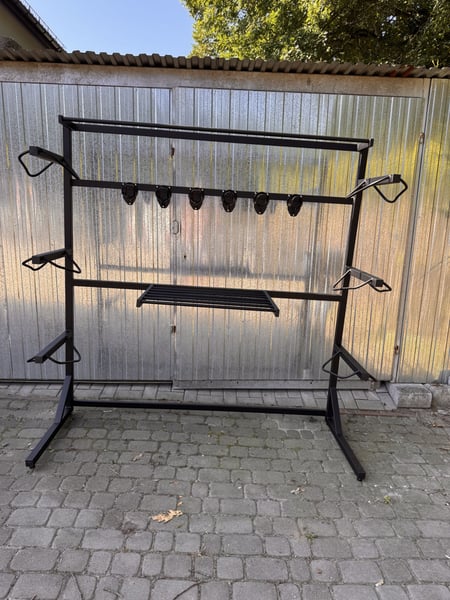 Stalowa ścianka siodlarniana. Praktyczna i estetyczna ścianka siodlarniana, wykonana z wysokiej jakości stali malowanej proszkowo. To niezastąpiony element wyposażenia każdej profesjonalnej siodlarni. Pomieści: • do 6 siodeł • do 6 ogłowi • do 6 czapraków • 1–3 derki (na górnej półce) Wymiary: 182x200x66 cm Zalety: • Solidna, stabilna konstrukcja stalowa • Starannie wykonane spawy i wykończenia • Malowanie proszkowe zapewnia odporność na wilgoć i uszkodzenia mechaniczne • Ergonomiczny układ uchwytów – szybki dostęp i dobra organizacja sprzętu Idealna do stajni sportowych, rekreacyjnych oraz prywatnych. Doskonale sprawdzi się zarówno wewnątrz, jak i w dobrze zadaszonych pomieszczeniach gospodarczych. Prezentowana ścianka jest standardem. Możemy dla Państwa wykonać podobną, jednak według Państwa projektu - w innych wymiarach, na kółkach, bez nóżek (do przykręcenia do ściany), w innym kolorze. Czas realizacji zamówienia: do 7 dni roboczych. Odbiór osobisty lub wysyłka na koszt kupującego. W celu uzyskania większej ilości informacji, zapraszam do kontaktu w wiadomości prywatnej lub telefonicznie. Stojak na siodło - wieszak na siodło - wieszak na ogłowie - ścianka siodlarniana - wieszak na derki - wieszak na czaprak