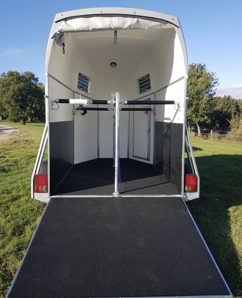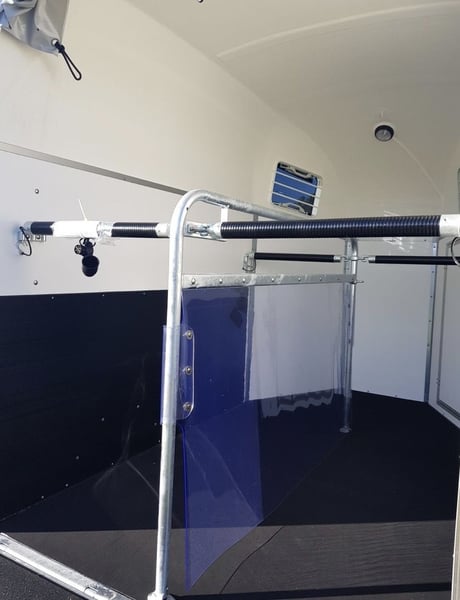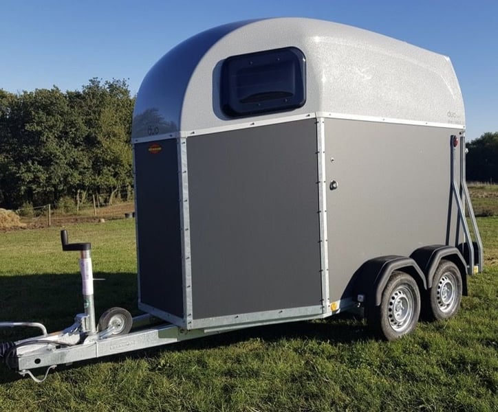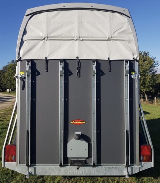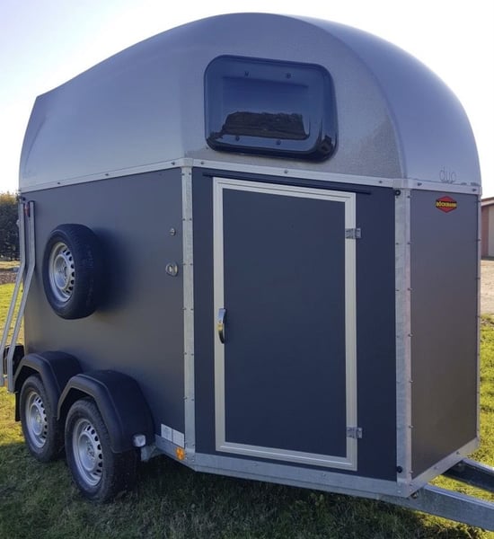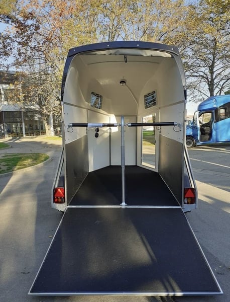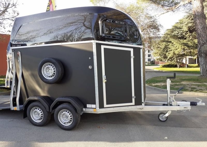 Marque: Bockmann Modèle: DUO Esprit Silver+Black Année: 2021 Première main: Oui Etat: Neuf Capacité: 2 Chevaux Pont Arrière. Chevaux voyagent: Tête avant Van BOCKMANN DUO ESPRIT Silver+Black avec pack luxe (2 places) EN STOCK . Parois plywood couleur gris granit . Toit en polyster gris métallisé . Barre de poitrail anti-panique . Bâche arrière manuelle . Roue de secours avec support . Roue jockey automatique . Tête d’attelage sans antivol (disponible au prix de 35€TTC) . Adaptateur 7/13 poles . Fenêtres rectangulaire ouvrables