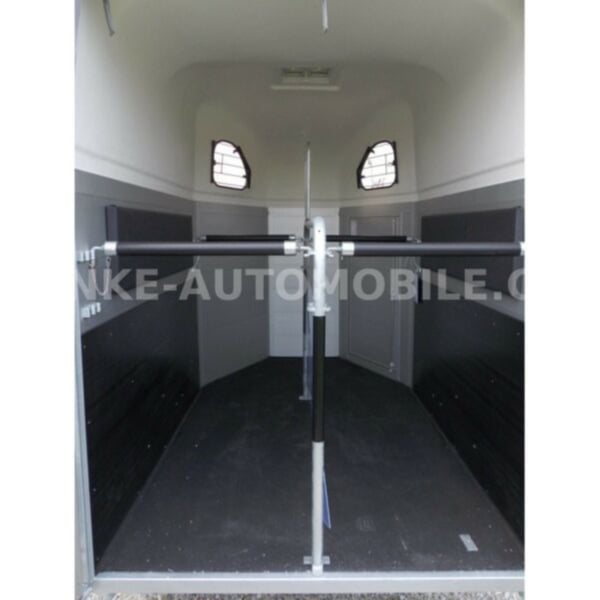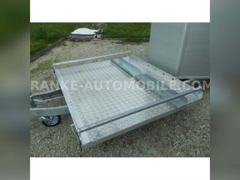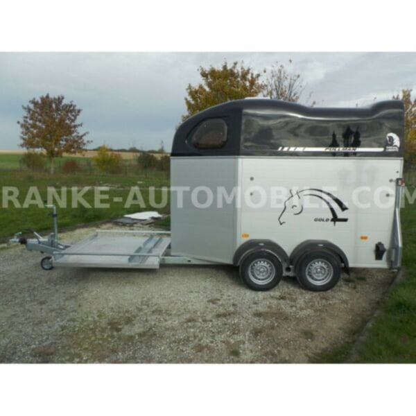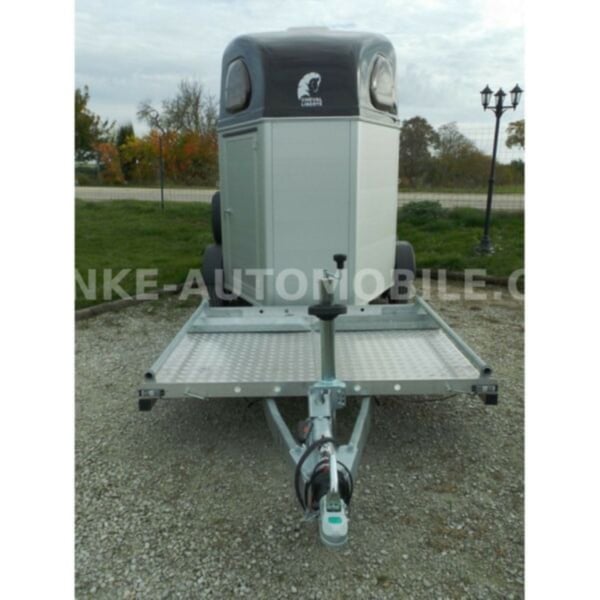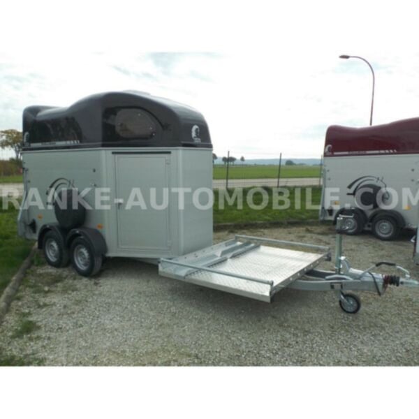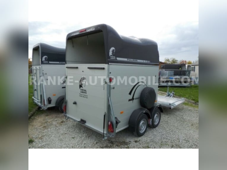 Category Animal/horse transportation, new vehicle Year of construction 2021 Permissible total weight 2,600 kg Axles 2 Payload 1,685 kg Width 2,150 mm Height 2,750 mm Load compartment length 3,150 mm Load compartment width 1,670 mm Load compartment height 2,300 mm Vehicle description For sale we offer a Cheval Liberte Hippomobile aluminum 2-horse trailer with carriage platform in front. We would be happy to advise you on our current stock of horse trailers. Standard equipment: hot-dip galvanized steel frame, rust-proof screws Side walls made of anodized aluminium Sturdy carriage platform made of aluminum checker plate with 2 drive-on ramps deep Pullmann II comfort chassis with wheel shock absorbers for 100 km/h approval Reinforced poly hood Color for poly hood: white, light grey, dark grey, black Ramp-door combination, convenient for loading with forklift, front loader, etc. ALU floor glued with 8 mm rubber flooring Tailgate with rubber floor and step strips Lockable passenger door, lock protected on the inside Barred tinted hinged windows Length and height-adjustable padded box bars roof ventilator step protection plates side cushions 2 tie-downs Spare wheel with holder and cover Panic release 4 marker lights Maneuvering handle Hay net Center partition Overrun brake with automatic reverse function Decor stickers on both sides outside 3rd brake light Rear fog light and reversing light Automatic jockey wheel Options: spacious lockable tack room with pull-out saddle holders, 2 bridle holders, mirror, storage net + 690,-. Plastic decor wheel covers on black steel rims + €120 Box lock +35,-€ Drawbar cover + 20,-€ Financing and trade-in possible. Errors, input errors and prior sale reserved.