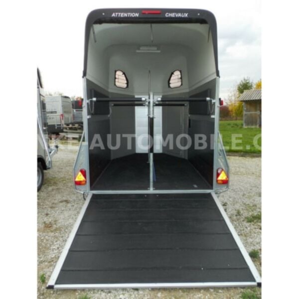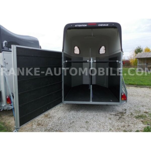 Catégorie Transport d'animaux/de chevaux, Véhicule neuf Année de construction 2021 Poids total autorisé 2.600 kg Essieux 2 Charge utile 1 685 kg Largeur 2.150 mm Hauteur 2.750 mm Longueur de l'espace de chargement 3.150 mm Largeur de l'espace de chargement 1.670 mm Hauteur de l'espace de chargement 2.300 mm Description du véhicule Nous proposons à la vente une Cheval Liberte Hippomobile Remorque en aluminium pour 2 chevaux avec plateforme pour calèche à l'avant. Nous nous ferons un plaisir de vous conseiller sur nos stocks actuels de vans pour chevaux. Équipement de série : cadre en acier galvanisé à chaud, vis inoxydables parois latérales en aluminium anodisé plate-forme de calèche stable en tôle striée en aluminium avec 2 rampes d'accès châssis confort Pullmann II profond avec amortisseurs de roue pour une homologation à 100 km/h capot en poly renforcé couleur du capot en poly : blanc, gris clair, gris foncé, noir combinaison rampe/porte, favorable au chargement par chariot élévateur, chargeur frontal, etc. Plancher ALU avec fond en caoutchouc de 8 mm collé hayon avec fond en caoutchouc et marchepieds porte de service verrouillable, serrure protégée à l'intérieur fenêtres à projection grillagées et teintées barres de box rembourrées réglables en longueur et en hauteur aérateur de toit plaques de protection pour les pieds rembourrages latéraux 2 attaches Roue de secours avec support et couvercle Déverrouillage anti-panique 4 feux de gabarit Poignée de manœuvre Filet à foin Paroi de séparation centrale Frein à inertie avec automatisme de recul Autocollant décoratif des deux côtés à l'extérieur 3ème feu de stop Feu arrière antibrouillard et feu de recul Roue jockey automatique Options : sellerie spacieuse et verrouillable avec porte-selles amovibles, 2 porte bridons, miroir, filet de rangement + 690,-. Enjoliveurs plastiques décoratifs sur jantes en acier noir + 120,- Antivol de coffre +35,-€. Capot de protection du timon + 20,-€. Financement et reprise possible. Sous réserve d'erreurs, de fautes de saisie et de vente intermédiaire.