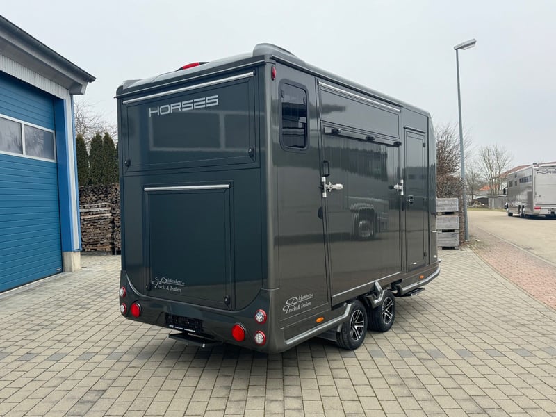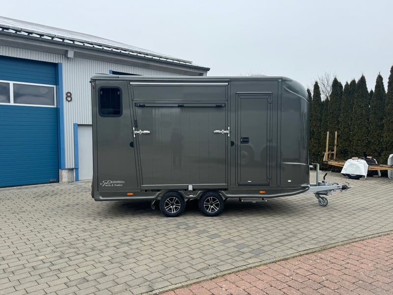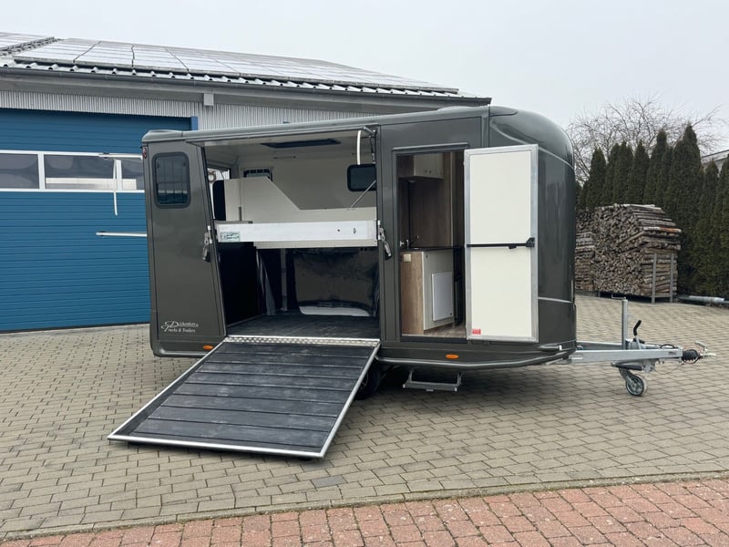 Équipement : 2 places de stationnement et compartiment de vie avec douche Nouveau van pour 2 chevaux avec compartiment de vie Poids total admissible : 3500 kg ; Soubassement en profilés d’aluminium Snaplock avec tapis en caoutchouc spécial collé ; Panneaux latéraux et de toit en poly pleine de 30 mm d’épaisseur, Design aérodynamique à l’avant, Rampe latérale en profilés d’aluminium avec caoutchouc antidérapant, ventilation par une trappe au-dessus ; Plancher en bois sur la rampe, Clôture réglable avec support pour le cou ; Porte latérale avec escalier rabattable facile à manipuler ; Grande cabine de séjour à l’avant, Deux fenêtres latérales à gauche et une à droite ; Une lucarne de toit ; Un abreuvoir fixe en dessous ; Box pour selle – sur demande avec armoire à selles mobile contre supplément ; Appartement entièrement équipé : Douche, De nombreux espaces de rangement, Micro-ondes, Réfrigérateur, Deux places assises avec table rabattable pouvant être transformée en lit superposé, Deux couchages, Évier, Fenêtres ouvrantes à l’avant. + + + Vidéo + + + Vidéo + + + Vidéo + + + https://youtu.be/totvbZVDHF4 Disponible immédiatement Livraison possible contre supplément Visite uniquement sur rendez-vous Demandes au 01606106131 -- 00491606106131 Nous avons toujours des remorques pour chevaux en stock, y compris équipements pour étalons, avec compartiment de vie ou sellerie.