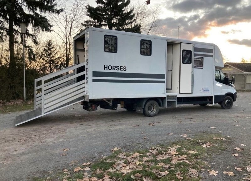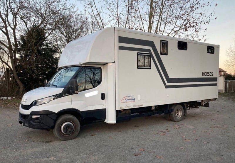 Trasporto cavalli Iveco Daily 70C17, senza pedaggio in Germania, immatricolato come veicolo speciale per camper, per 3 cavalli, cambio automatico, telecamera posteriore, gancio di traino, immatricolato a settembre 2015, allestimento come trasporto cavalli nel 2019, 136.000 km, revisione valida fino ad agosto 2026, peso totale 7,2 tonnellate, alta capacità di carico, ampio spazio di stivaggio, telecamera di sorveglianza nella zona cavalli, cabina abitativa con fino a 4 posti letto, doccia, fornello, lavello, frigorifero. Il veicolo si presenta in condizioni estetiche e tecniche molto buone. Tel.: 01520/2790298 Prezzo: trattabile