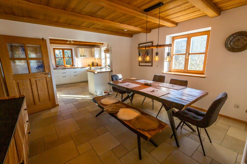 Einziehen, wohlfühlen und losreiten Dieses wunderschön gelegene Anwesen mit besonderem Charme liegt in freier Dorfrandlage und ist bereits ideal für die Pferdehaltung ausgelegt. Darüber hinaus eignet es sich hervorragend für Selbstversorger, Freiberufler oder Kleingewerbe – oder einfach als außergewöhnliches Familienzuhause auf dem Land. Direkt an der Grenze zu Oberbayern gelegen und mit Anschluss an die A94 ist München in etwa einer Stunde erreichbar. Kurzbeschreibung - idyllische Außenbereichslage am Türkenbach mit altem Laubbaumbestand - nur ein direkter Nachbar - ca. 11.006 m² arrondiertes, ebenes Grundstück - vollständig eingezäunter Pferdebereich mit befestigtem Paddock, Koppeln, Trail und Stallungen - Reitplatz 20 × 40 m mit hochwertigem Reitsand, Bewässerung und Flutlicht - Gemeindestraße am Grundstück; B20 ca. 100 m Luftlinie (höher gelegen, kaum hörbar) - Wohnhaus in Massivbauweise (Grundbaujahr ca. 1955), laufend modernisiert und erweitert - umfangreiche Sanierungen (u. a. Dach- und OG-Ausbau, Fenster, Haustüre, Bäder, Kleinkläranlage) - kein Renovierungsstau; wesentliche Wohnbereiche modern gestaltet - Kombination aus massiven Außenwänden (bis ca. 48 cm) und moderner Holzständerbauweise - Parkett-, Dielen-, Fliesen- und Laminatböden - Flüssiggas-Zentralheizung, Fußbodenheizung in Küche, Esszimmer und Bädern - Kachelofen mit Herd und Backrohr (autark nutzbar) sowie zusätzlicher Holzofen - öffentlicher Wasseranschluss und eigene Kleinkläranlage - großer Lagerbereich mit Ausbaupotenzial Raumaufteilung Wohnhaus: - EG: großes Wohnzimmer, offene neue Küche mit Esszimmer, neues Bad mit bodengleicher Dusche, Wintergarten (unbeheizt), überdachte Terrasse - OG: vier Zimmer, kleines Bad mit Wanne und WC - DG: Studio 1 neu ausgebaut; Studio 2 ausbauvorbereitet - KG: Vorrats- und Heizraum (teilunterkellert) Nebengebäude und Außenanlagen: - großzügige Werkstatt (ca. 48 m²), aktuell als Sattelkammer genutzt - zwei Garagen, eine mit elektrischem Rolltor und E-Ladestation - isolierte Scheune/Lagerhalle (ca. 55 m²) für Heu, Stroh, Pferdeanhänger - zusätzliche Lagerflächen - Reiterstübchen mit Blick auf den Reitplatz - uriges Jagdstüberl mit Keller - Unterstände, eingefriedeter Blumengarten, Gartenteich, Feuerstelle, Obstbäume - Flüssiggastank PV-Anlage - 9,9 kWp PV-Anlage mit 19,5 kWh Batteriespeicher (Bj. 2019) - Wallbox Spezielle Informationen zur Pferdehaltung: Der ausgebaute Pferdebereich bietet Platz für etwa 4 Pferde in Paddockboxen oder Offenstallhaltung. Der Pferdebereich wurde mit viel Sachverstand und Liebe zum Detail angelegt und bietet optimale Bedingungen für eine artgerechte, ganzjährige Haltung. - direkter Zugang von Boxen zu Paddock und Koppeln, optional über Trail - neu und Shetland-sicher eingezäunt - Stallgebäude mit betoniertem Boden, Waldbodeneinstreu und Paddockplatten/Gummimatten - befestigter, drainierter Paddock (kein Matsch) - frostsichere beheizte Tränke - überdachter Putzplatz, Waschplatz und betonierte Mistplatte - professionell gebauter Reitplatz mit Oberflächenentwässerung, Spezial-Reitsand mit Bewässerung und Flutlichtmast für gute Trainingsmöglichkeiten - direkter Zugang ins weitläufige Ausreitgelände, Ausritte bis zum Inn möglich - diverse Reitvereine in nur 10-20 Minuten erreichbar - Reiterstüberl - Scheune mit ausreichend Platz für Heu, Stroh, Pferdeanhänger und Reitplatzplaner - zuverlässige Heu-/Strohlieferanten und Abholer Pferdemist vorhanden Hinweis zur Lage am Bach Obwohl das Anwesen direkt am Türkenbach gelegen ist, läuft der Bach deutlich (mehrere Meter) unterhalb des Grundstücks. Daher war das Anwesen weder während des Hochwassers 2016 noch während der Überflutungen 2024 in irgendeiner Weise betroffen. Energieausweis Verbrauchsausweis, gültig bis 03.04.2032 Wesentlicher Energieträger: Flüssiggas und Stückholz Baujahr 1955 Energieklasse G Zur Umgebung Untertürken ist ländlich geprägtes Dorf in der niederbayerischen Gemeinde Zeilarn. Einkaufsmöglichkeiten finden Sie in Stammham (ca. 3 km, Dorfladen, Metzgerei), sowie in den Märkten Marktl (ca. 5 km) und Tann (ca. 7 km) mit Lebensmittelgeschäften, Discountern, Bäcker, Metzger, Apotheken, Ärzten, Banken usw. Die Umgebung bietet vielfältige Sport- und Freizeitmöglichkeiten (z.B. Wanderwege, Radwege, Badeseen, Golfplätze, Thermen usw.) Entfernungen von Untertürken: Simbach/Inn ca. 12 km Braunau/Oberösterreich ca. 15 km Burghausen ca. 15 km Eggenfelden ca. 20 km Kreisstadt Pfarrkirchen ca. 23 km Mühldorf ca. 34 km Bad Füssing ca. 38 km Bad Griesbach (Golf und Thermen) ca. 40 km Passau ca. 63 km Chiemsee ca. 65 km Salzburg ca. 75 km Flughafen München ca. 104 km München ca. 110 km Über die A94 (Anschluss Marktl, ca. 8 km) ist München in etwa einer Stunde erreichbar. Zusätzlich besteht ab dem Bahnhof Marktl (ca. 5 km) eine sehr gute und direkte Zuganbindung nach München – ideal für Pendler. Die derzeitigen Eigentümer arbeiten selbst in München und pendeln die Strecke mehrmals pro Woche.