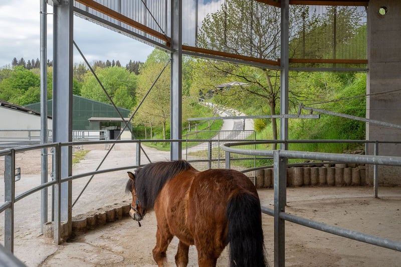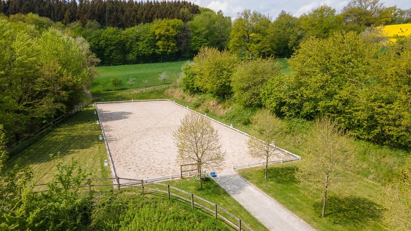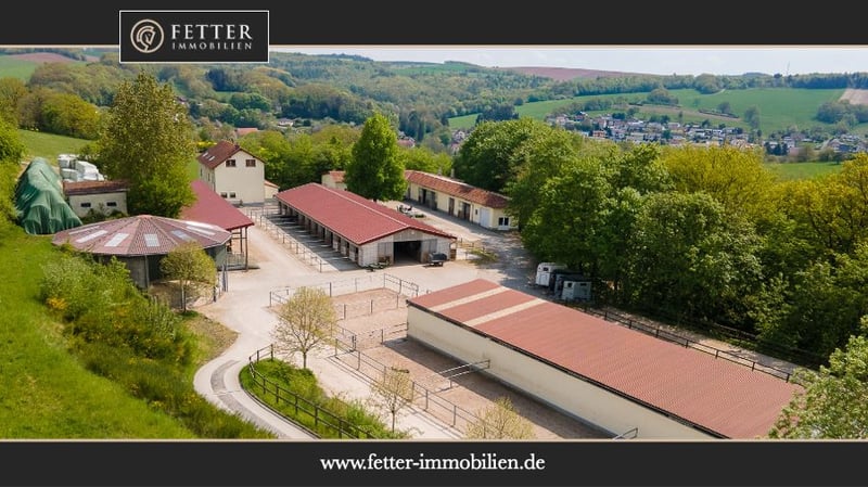 Bitte füllen Sie das nachfolgende Kontaktformular vollständig aus bevor Sie uns telefonisch kontaktieren. Vielen Dank für Ihr Verständnis! Reitanlage im Saarland mit professionellen Trainingsbedingungen und großem Wohnhaus! Objektbeschreibung: Die Reitanlage befindet sich in einem Ortsteil der Stadt St. Wendel im Saarland und umfasst eine Grundstücksgröße von rund 148.811 m² im Eigentum – vollständig am Hof gelegen. Der Betrieb ist derzeit als Pensionsbetrieb ausgelastet und bietet Pferd und Mensch ideale Trainingsbedingungen und eine pferdegerechte Haltungsform. Das Wohnhaus aus dem Jahr 1970 umfasst rund 300 m² Wohnfläche, verteilt auf 3 Etagen plus Keller. In den Jahren 2010 – 2012 wurde nicht nur der Betrieb von einem ehemaligen Milchviehbetrieb zur Pferdepension, sondern auch das Wohnhaus bekam einen neuen Charakter. Heute finden Sie moderne und helle Wohnräume wieder, einen einladenden Wintergarten und freie Sicht über die Reitanlage. Das Haus wird über eine Flüssiggas-Heizung aus 2010 beheizt, verfügt über Öfen und Doppelverglasung aus 1996. Die Reitanlage wird im Herzstück aus einem modernen und gut belüfteten Stallgebäude gebildet, hier befinden sich 24 Paddockboxen (Maße 3 x 4 Meter) zzgl. angrenzendem Paddock. Ein seperates Gebäude umfasst Laufställe für bis zu 8 Pferde mit Sand-Auslauf. Das Wirtschaftsgebäude aus 1994 – 1996 umfasst neben beheizten Sattelkammern, Kunden-WC’s, Umkleiden und Reiterstube auch mehrere Putz- und Waschplätze sowie eine Futterkammer. Zwei Bergehallen ermöglichen die Lagerung von 400 Rundballen, während die Mistentsorgung über eine große Mistplatte erfolgt. Für das tägliche Training bietet die Immobilie eine Führmaschine für 4 Pferde, eine Longierhalle (15 Meter Durchmesser), eine Reithalle aus 1993 mit den Maßen 19 x 42 Meter und einen traumhaften Dressurplatz aus 2012 mit einem Ebbe-Flut-System & den Maßen 20 x 60 Meter. Die im Eigentum befindlichen knapp 15 ha Weidefläche am Hof bieten beste Futtergrundlage, aber natürlich auch wunderbare Ausläufe für die Pferde. Auch hier befinden sich Selbsttränken, für entspanntere betriebliche Abläufe. Die Reitanlage vereint ideale Trainingsbedingungen, auch für den hohen Sport, mit dem Charme der Alleinlage und atemberaubenden Grundstücksflächen! Ausstattung: Wohnhaus: - Baujahr: 1970, Dachgeschoss 1992, Wintergarten EG 1995 - Wohnfläche: ca. 300 m² zzgl. Nutzflächen - Heizung: Flüssiggas aus 2010, Öfen in EG und DG (Heizungsrohre aus 1970) - Fenster: Kunststoff, Doppelverglasung aus 1996 - Modernisierung: 2010 – 2012 gesamtes Haus (Küche EG aus 2012 Marke Alno) Stallgebäude: - Baujahr Gebäude 2010 - 24 Paddockboxen, Maße 3 x 4 Meter plus Paddock - Hersteller: DS Stahl, Interieur von MBH Stahlbau Henkel - Dach: Trapezblech mit 40 mm Dämmung Laufställe: - Separates Gebäude - Laufställe für 8 Pferde mit angrenzenden Sand-Paddocks Wirtschaftsgebäude: - Baujahr: Ursprung 1994 für den ersten Teil als Lager, 1995 Erweiterung als Milchabfüllstation des damaligen Betriebes, 1996 Anbau von Lager- und Sozialräumen - Reiterstube / Sozialbereich für Einstaller mit rund 100 m² - Putzplätze mit Gummi-Matten, Solarium - Waschplatz mit Warmwasser - Futterkammer - Beheizte Sattelkammern, Kunden WC, Umkleidebereiche Reithalle: - Baujahr 1993 - Reitmaß ca. 19 x 42 Meter - Boden: Reitsand Vlies (Columbus Professional Horse Equipment) - Schöppler-Beregnungsanlage vorhanden - Reithallenbande “Safety Wall” - Dach: Wellplatten (asbestfrei) - Konstruktion: Stahl, Lochblech an den Seiten Dressurplatz: - Baujahr 2012 - Reitmaß 20 x 60 Meter - Boden: Reitsand (Columbus Professional Horse Equipment), Ebbe-Flut-System - Einfriedung mit weißem Zaun Führmaschine: - Baujahr 2010 - Pferdeanzahl: 4 - Boden: Beton - Überdachung - Hersteller: MBH Henkel Longierhalle: - Baujahr 2013 - Durchmesser 15 Meter - Boden: Reitsand - Beregnungsanlage Heulager - Zwei Hallen mit insgesamt 300 m² Bruttogrundfläche - Boden: Beton - Überdachung mit Trapezblech, 3 Seiten offen Weiteres: - Werkstatt - Mistplatte zur Festmistlagerung - Sandpaddocks und Koppeln am Hof Lage: Die Reitanlage befindet sich in einem Ortsteil des Gemeindebezirks der Stadt St. Wendel im Landkreis St. Wendel im Saarland. Mit dem Auto besteht eine schnelle Anbindung an die Bundesstraße B41 und damit an die Region Richtung Saarbrücken und Neunkirchen. Die nächsten Autobahnen sind die A62 (Anschlussstelle Freisen) und die A1 (Anschlussstellen Tholey oder Illingen) in gut erreichbarer Entfernung mit dem Auto. Über das Straßennetz von St. Wendel ist man in etwa 15–25 Minuten an einer Auffahrt. Der öffentliche Nahverkehr erfolgt hauptsächlich über Buslinien nach St. Wendel, wo es auch einen Bahnanschluss gibt. St. Wendel überzeugt durch eine hervorragende Infrastruktur und eine hohe Lebensqualität, die sowohl für Familien als auch für Singles attraktiv ist. Die Stadt bietet eine breite Auswahl an Schulen aller Bildungsstufen, von Grundschulen über Realschulen bis hin zu Gymnasien, sowie vielfältige Möglichkeiten der Ganztagsbetreuung. Für die jüngsten Bewohner stehen zahlreiche Kindertagesstätten und Kitas zur Verfügung, die eine flexible Betreuung ermöglichen. Die medizinische Versorgung ist ausgezeichnet. Neben einem Krankenhaus gibt es zahlreiche Haus- und Fachärzte sowie Apotheken, die eine schnelle und unkomplizierte Gesundheitsversorgung sicherstellen. Einkaufsmöglichkeiten für den täglichen Bedarf, darunter Supermärkte, Fachgeschäfte, Bäckereien und Märkte, sind zentral gelegen und leicht erreichbar. Die Innenstadt lädt zudem mit Restaurants, Cafés und kulturellen Angeboten zum Verweilen ein. Freizeitmöglichkeiten werden in St. Wendel großgeschrieben: Parks, Grünflächen, Sportvereine sowie Rad- und Wanderwege sorgen für ein aktives Leben im Grünen. Zahlreiche Veranstaltungen, Märkte und Feste stärken das Gemeinschaftsleben und verleihen der Stadt einen leben
