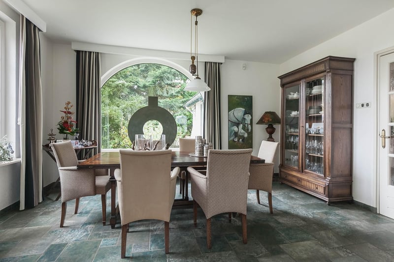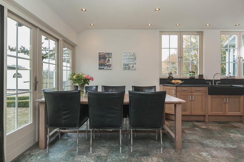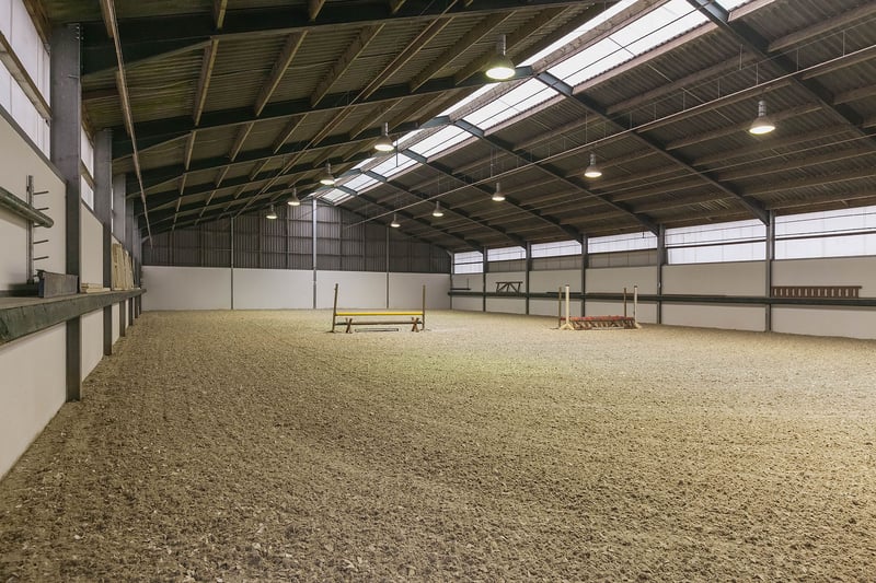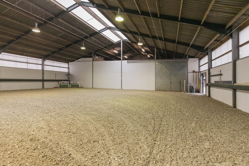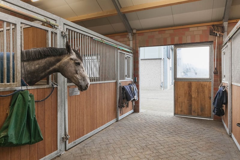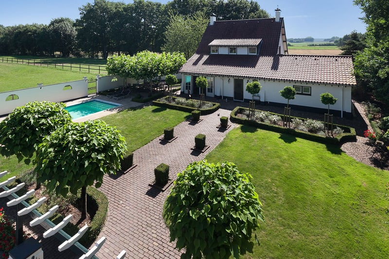 Complete equestrian property equipped with, among other things, a detached residence, an indoor riding arena with a storage/stable area and a 3-room apartment, 2 detached horse stables with a total of 13 horse boxes, an outdoor arena, a covered horse walker, a lunging circle and pastureland which is divided into several paddocks. RESIDENCE The detached house offers plenty of space and is arranged with a living room, kitchen-diner, utility room and a bedroom and bathroom on the ground floor. On the 1st floor there are three more bedrooms and a second bathroom. On the 2nd floor there is an attic space. Ground floor: The entrance hall of the house is equipped with a tiled floor with underfloor heating, plastered walls and a plastered ceiling with recessed lighting. The entrance provides access to the kitchen-diner, the toilet room and a storage/utility room. The toilet room is equipped with a floating toilet, a small washbasin and natural ventilation. The storage/utility room is finished with a tiled floor with underfloor heating, plastered walls and a plastered ceiling with recessed lighting. In the utility room there is also a kitchen unit with a sink and connections for washing appliances. The extended kitchen-diner enjoys plenty of natural light through large windows and French doors. These offer a beautiful view of the surrounding garden and the equestrian facilities behind it. The kitchen was modernised approximately 10 years ago and is fitted with a luxurious country-style kitchen layout, equipped with a granite worktop, a double sink, a gas stove (Boretti) with 4 burners, a griddle and a wide oven, an American refrigerator, a combi microwave, built-in coffee machine and a dishwasher. The kitchen-diner has a tiled floor, plastered walls and a plastered ceiling with recessed lighting. A corridor connects the kitchen-diner with the living room, the cellar and the master bedroom. From the corridor a fixed staircase provides access to the 1st floor. The corridor is finished with a tiled floor with underfloor heating, the walls are finished in granol and there is a plastered ceiling. The meter cupboard is also located in the corridor. The spacious living room has been extended and features a tiled floor with underfloor heating, plastered walls and a plastered ceiling with recessed lighting. Beautiful semi-circular windows provide plenty of natural light and offer a wonderful view over the pasture. A pellet stove provides additional atmosphere and warmth in the room. The spacious master bedroom is finished with a wooden floor, plastered walls and a plastered ceiling with recessed lighting. The bedroom has an en-suite bathroom. The fully tiled bathroom is equipped with a bathtub, a separate shower, a double fixed washbasin with storage cabinet, a floating toilet and a designer radiator. The plastered ceiling has recessed lighting. 1st floor: The landing provides access to 3 bedrooms and the second bathroom. From the landing, an enclosed fixed staircase provides access to the attic. Bedroom I and II are both spacious and feature a wooden floor, plastered walls and a panelled ceiling. In addition, both rooms have a practical built-in wardrobe and one of the rooms has a dormer window. The 2nd bathroom is fully tiled and equipped with a bathtub with shower option, a washbasin with storage cabinet and a toilet. A dormer window provides plenty of natural light. The landing provides access to 3 bedrooms and the second bathroom. Bedroom III is also finished with a wooden floor, plastered walls and a panelled ceiling. This room is also equipped with a fixed washbasin and a built-in wardrobe. 2nd floor: The attic on the second floor is accessible via a fixed staircase and is equipped with a wooden floor, an insulated roof and the installation of the central heating combi boiler. GARDEN The spacious garden surrounds the house and separates the living area from the equestrian facilities located behind it. The beautifully landscaped and atmospheric garden is well maintained and features a large lawn, border planting and decorative paving with baked bricks. The garden also includes a cosy terrace covered by espalier trees and a heated outdoor swimming pool (renewed). EQUESTRIAN FACILITIES The equestrian facilities consist, among other things, of a detached indoor riding arena with an apartment and storage/stable space, an indoor riding arena and two detached horse stables with a total of 13 horse boxes. Riding arena with indoor apartment and storage/stable space: The detached riding arena on the ground floor is arranged with an indoor arena, a large storage/stable area, a storage room, toilet room, two wash areas and a tack room. On the 1st floor there is a reception area/apartment with a kitchen, shower room, toilet room and 2 (bed)rooms. The storage room is finished with a brick floor and equipped with a simple kitchenette. The partly tiled toilet room is equipped with a toilet and the meter cupboard. Two wash areas have a brick floor and the walls are covered with rubber. The wash areas are equipped with hot and cold water. The heated tack room is finished with a brick floor and masonry walls. The irrigation pump for the indoor arena is located in the tack room. In the front part of the riding arena there is a large storage and stable space which is accessible from the yard through 2 electrically operated roller doors. This space is constructed with concrete elements and steel trusses. The roof is covered with asbestos-free corrugated sheets. The floor is paved with bricks. A sliding door provides direct access to the indoor arena located behind it. The indoor arena (approx. 21 x 40 m) is equipped with a professional surface and an irrigation installation. The riding arena is constructed with concrete elements and steel trusses and the roof is covered with asbestos-free corrugated sheets. A skylight has been installed in the ridge of the roof. A sliding door in the side wall provides access to the yar