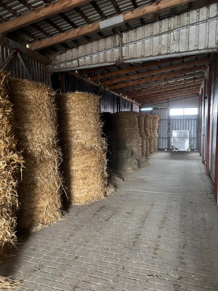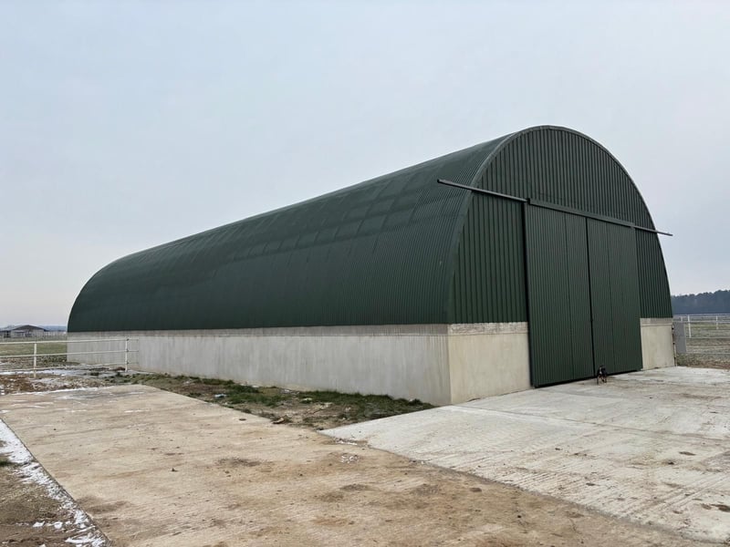 Arch hall for hay and straw (built 2024): 30m x 12m, height 7m, accommodates 600-800 bales