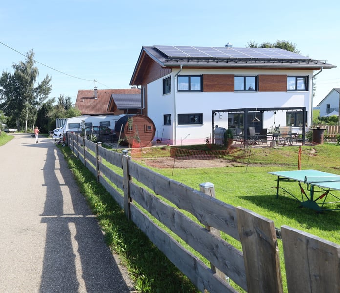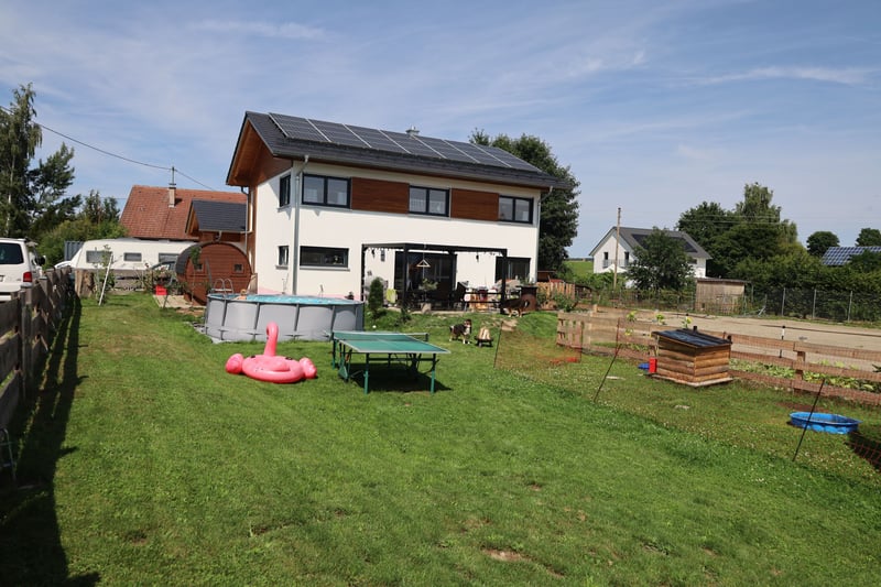 An exclusive property that is rarely found in this combination: opportunities for horse keeping directly at the house or spacious garden design on 1,786 sqm, combined with peaceful, relaxing countryside living and modern, highly efficient living in perfect infrastructural connectivity. Property Description: Built in 2021, the KfW 40+ house offers approximately 220 sqm of living space over two floors and provides ample space for families to unfold. The ground floor impresses with a solid wood ceiling, while the upper floor features an open exposed roof truss, allowing for the addition of a gallery in the upper rooms. Both floors, as well as the small granny flat, are equipped with all connections for kitchens and barrier-free bathrooms and toilets. This offers versatile usage options. All construction work was carried out by regional craftsmen, ensuring high-quality, value-stable living and a well-thought-out room layout for your dream home. A total of 10 rooms with upscale furnishings are available. A high-quality island built-in kitchen forms the heart of the bright living room, which provides direct access to the spacious terrace with a pergola. From there, you can enjoy the extensive garden or the horse facility, where you can observe your animals right outside your door. The horse facility was designed for easy dismantling, so the entire area can quickly be repurposed for other uses. A chicken area with two henhouses completes the garden to the east. Schedule your viewing appointment now and take a step closer to your dream home! Viewing requests are kindly accepted via email for organizational reasons. The property is available by arrangement. Features: Tiles, parquet floors, underfloor heating, barrier-free bathrooms, electric shutters, ventilation system with heat recovery, LAN, fireplace... Location: Kammlach leaves nothing to be desired: you are in a family-friendly community in beautiful Unterallgäu, where everything is still in order. The village has a primary school, kindergarten, daycare, diverse sports offerings, and numerous clubs. A supermarket is located directly in the village. The natural surroundings with forests, cycling, and hiking trails offer high recreational and leisure value. At the same time, you can reach the district town of Mindelheim in 10 minutes by car, where all city amenities and secondary schools are available. Kammlach’s location and connectivity are also impressive: the A96 motorway exit is only 5 km away. From there, Munich can be reached in 60 minutes, Ulm and Augsburg in 50 minutes. The Bavarian Alps are also about an hour away. Additional Information: For horse owners: The riding arena (approximately 20x20 m) is professionally paved with RIDCON slabs and sanded, as is the paddock area (about 20 x 6 m), which includes an open stable (about 3 x 6 m) with tack room. There is also an externally fillable feed trough. If needed, there is potential to lease approximately 1.5 hectares of paddock land nearby. The current hay storage and manure disposal can continue to be used. Extensive riding terrain is directly accessible without traffic. In the technical room, there is a three-chamber buffer storage tank for heating and hot water, heated by a Brötje air heat pump. Additionally, there is a water softening system and a BYD battery storage unit, which stores the electricity generated by the PV system for self-use.