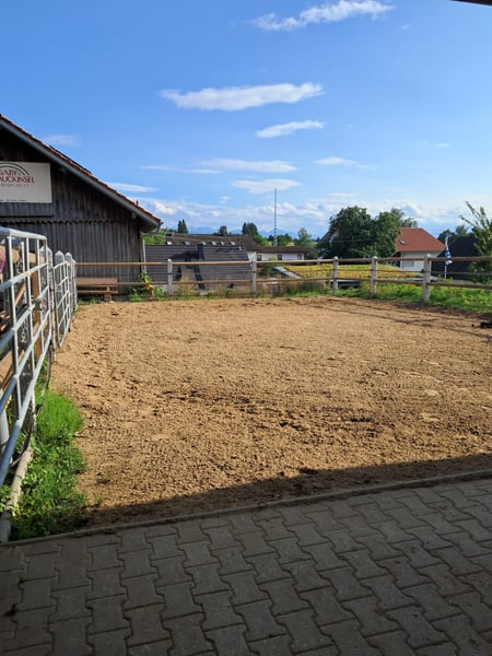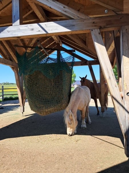 Wir teilen uns einen kleinen aber feinen Offenstall. Dort stehen uns 24h Heu an zwei Fressstellen zur Verfügung. Wir haben auch eine eingestreute Box mit Tränke inklusive.