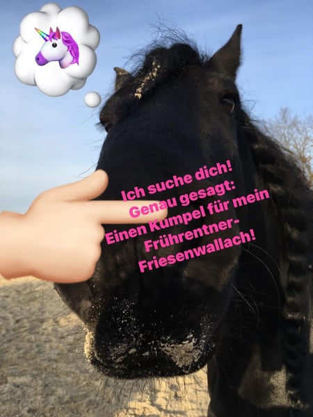 Mein Frührentner-Friesenwallach (17, super sozial, nur lieb mit allen Lebewesen) sucht einen Kumpel als Einsteller mit etwas Kosten- und gerne auch Arbeitsbeteiligung. Wenn möglich auch ein Rentner-Wallach, der noch ein paar schöne Jahre in gesunder Offenstallhaltung in bester Gesellschaft verbringen möchte. Scheune als Offenstall mit Gummimatten vorhanden, 24/7/365 Weide( 1,5 Hektar) und 30x60 Paddock auf gepflegten Privathof in Grossefehn. Betreuung und tägliche Kontrolle der Pferde inklusive. Heu Fütterung inklusive, Kraftfutter etc. exklusive.