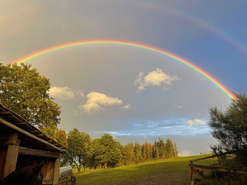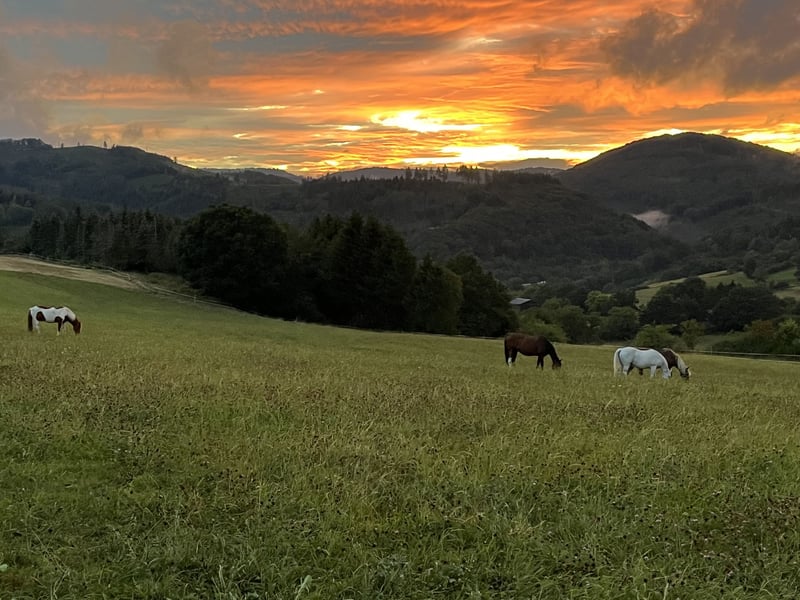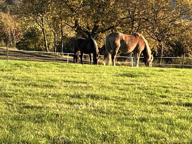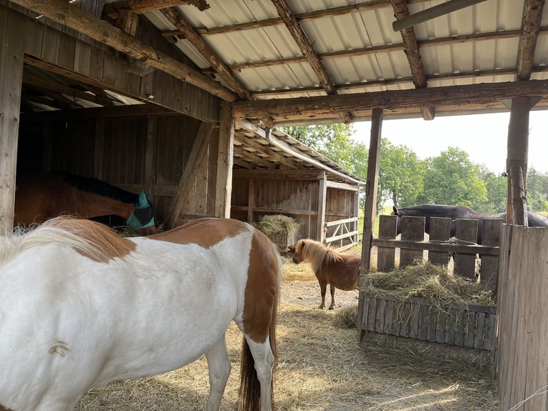 Schöner Offenstallplatz ab November frei kleine, nette Stallgemeinschaft 24/7 Weidegang/ Auslauf Sommerstall + Winterstall Sattelkammer + gemütliches Reiterstübchen schönes Ausreitgelände Heu aus eigener Produktion (Bio)