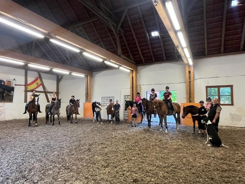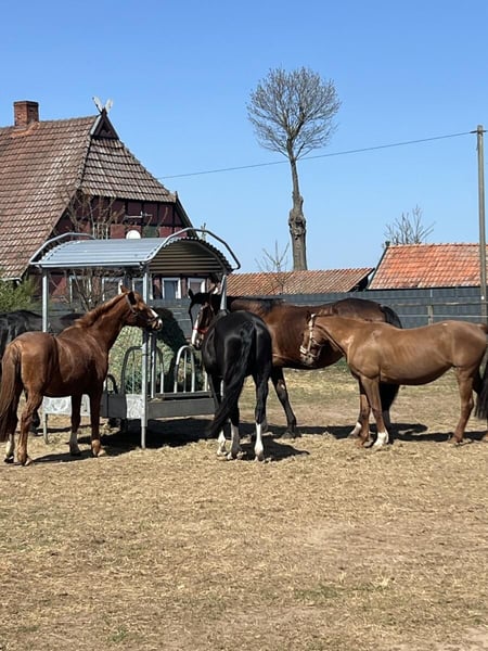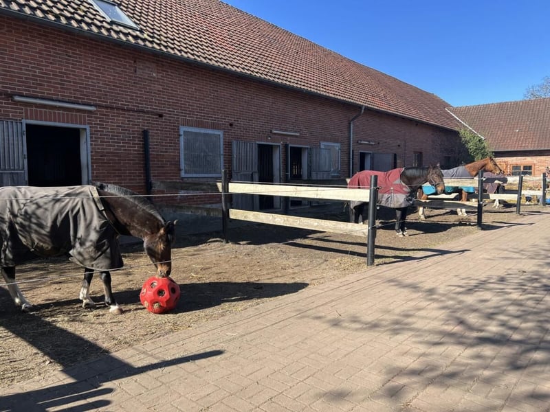 Bei uns steht das Pferdewohl an erster Stelle. Wir haben große Boxen (5x6m) mit anschließendem großen Paddock. 24/7 Heufutterung ist für uns selbstverständlich. Kraftfutter wird Morgens und Abends gegeben. Die Pferde werden nach dem Kraftfutter raus gebracht. Im Sommer auf die Wiesen und im Winter auf trockene Paddocks mit 5-6 Pferden. Wir achten sehr darauf, dass die Herden harmonisch sind und kein Pferd im Stress draußen steht. Außerdem gibt es immer mehrere Futterplätze um Streitereien zu vermeiden. Es gibt eine Reithalle mit gelenkschonendem, staubarmen Vlies in 15x30m ist vorhanden. Der Außenreitplatz ist 20x40m Unser Ausreitgelände ist ohne stark befahrene Straße erreichbar, wunderschön und sehr weitläufig mit Badeseen. Selbstverständlich kann man sein Pferd trocken putzen und fertig machen und die Sattelkammern sind großzügig mit genug Platz. Auch eine Pferdedusche mit warmen Wasser steht auch zur Verfügung. Für Allergiker sehr gut geeignet da die Anlage gut belüftet ist und ein Heubedampfer vorhanden ist. Auch Rehepferde sind bei uns willkommen und werden bedarfsgerecht versorgt. Ausmisten muss jeder selbst wie er es für richtig hält und es gibt abappel Dienste für die Paddocks. Eine Reitlehrerin mit Erfahrung mit schwierigen Pferden und Angstreitern ist vor Ort. Diese macht gerade eine Weiterbildung in Pferdeosteopathie. Für freuen uns auf Anfragen und ein Kennenlernen.