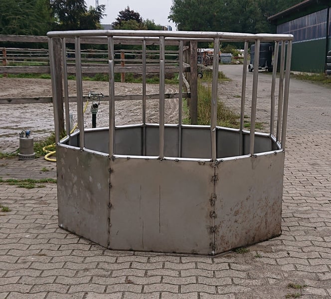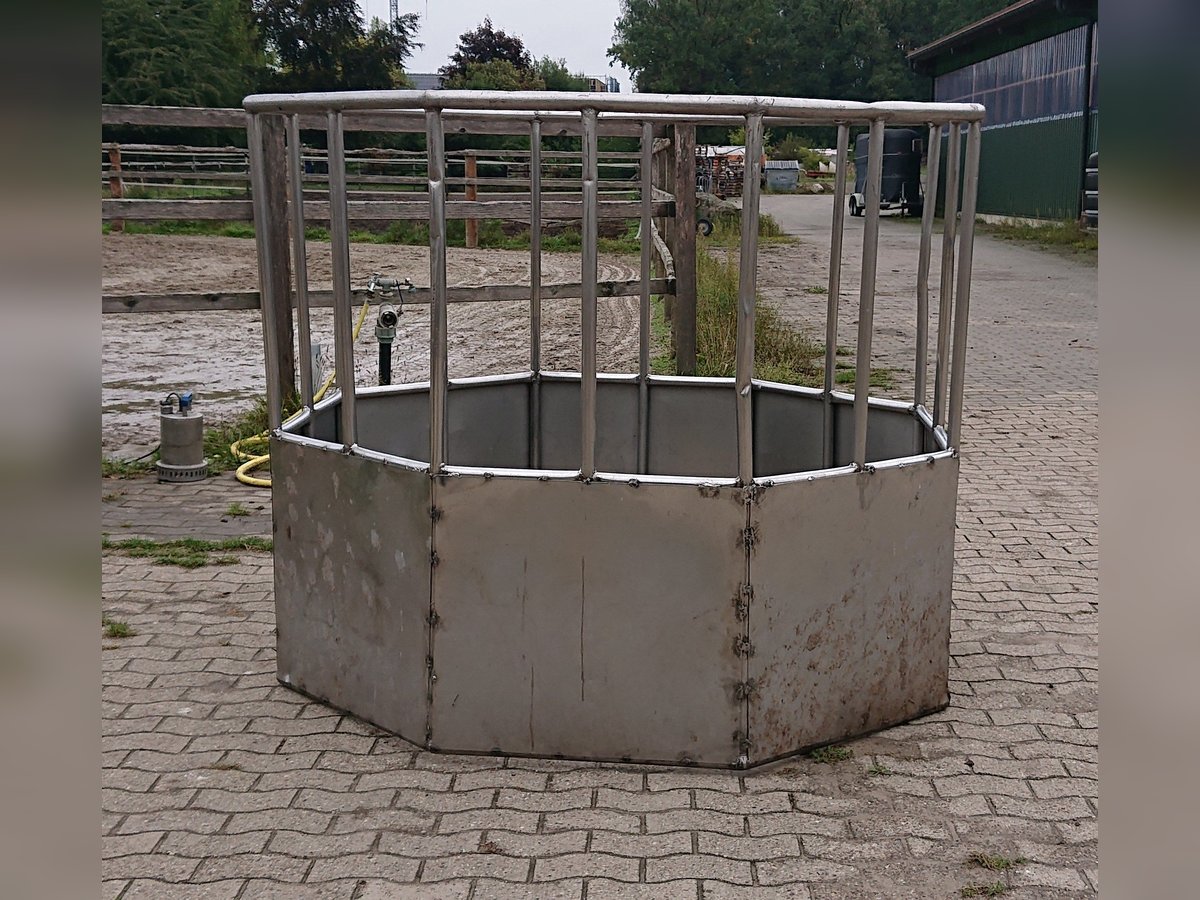 Raufe aus V2A achteckig 16 Fressplätze Fressplatzbreite 33cm Durchmesser 1,75m Höhe geschlossener Rahmen 0,71m Höhe bis unterhalb des oberen Rohres 1,52m Auf Grund der Aufgabe der Mutterkuhhaltung stehen weitere Stalleinrichtungen zum Verkauf: leichtes Tor und Fressgitter von Patura.