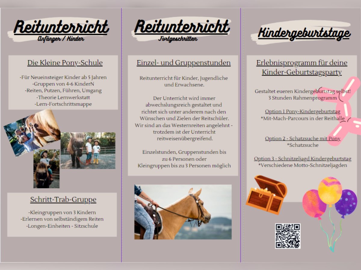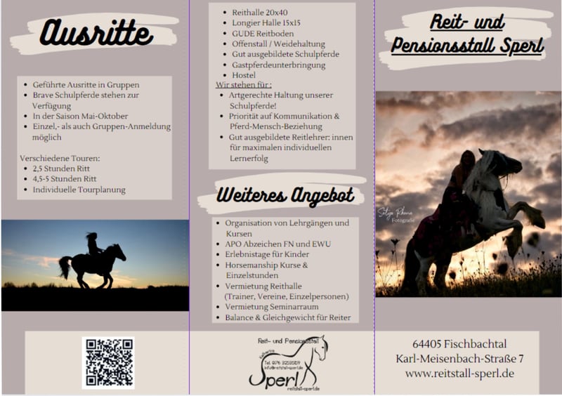 Reitunterricht für alle – denn gutes Reiten kennt keine Reitweise. Ob Anfänger, Wiedereinsteiger oder Turnierreiter: Bei uns findest du fachlich fundierten, reitweisenunabhängigen Unterricht, der dich und dein Pferd wirklich weiterbringt. Denn gutes Reiten hat keinen Stil – es basiert auf Gefühl, Wissen, Timing und echter Kommunikation zwischen Mensch und Pferd. Vier Trainer – vier Fachkompetenzen Unser Trainerteam deckt ein breites Spektrum ab und bietet für jedes Niveau das passende Angebot: • Reitpädagogik ab 2,5 Jahren – spielerisch, kindgerecht, liebevoll • Reitanfänger ab 5 Jahren – erste Grundlagen, sicherer Sitz, Balance • Fortgeschrittene – feine Hilfengebung, korrekte Gymnastizierung • Trainerin B Westernreiten – für ambitionierte Reiter mit sportlichen Zielen Unsere Schulpferde: zuverlässig, gut ausgebildet und bestens versorgt Unsere braven Schulpferde stehen in artgerechter Gruppenhaltung mit viel Bewegung. Regelmäßige Korrekturarbeit, Osteopathie, Zahnarzt und weitere Gesundheitschecks sorgen dafür, dass sie körperlich wie mental in Topform sind – und motiviert mit unseren Reitschülern arbeiten. Beste Bedingungen für deinen Lernerfolg • Zwei Reithallen (groß & klein) • Traumhaftes Ausreitgelände • Theorie-Werkstatt für vertieftes Wissen • Regelmäßige Fortbildungskurse • Abwechslungsreicher Unterricht für mehr Motivation und nachhaltiges Lernen Reiten lernen mit System, Herz und Verstand – für alle Altersklassen, alle Ziele und jede Reitweise. Mehr Informationen unter: https://www.reitstall-sperl.de/reitunterricht97a90184