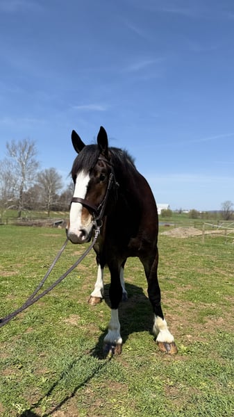 ⚜️𝐭𝐡𝐞 𝓔𝓵𝓲𝓽𝓮 𝐒𝐩𝐫𝐢𝐧𝐠 𝐂𝐥𝐚𝐬𝐬𝐢𝐜⚜️ Happening now thru MONDAY | APRIL 20th - Available EXCLUSIVELY on HorseBid's website! For more details and to register visit: www.Horsebid.com CONSIGNOR CONTACT: CM Farms 717-875-2061 LOCATION: Gap, PA BREED: Clyde/Perch/QH REGISTERED: No REGISTERED NAME: Clifford COLOR: Bay HEIGHT: 17 AGE: 6 GENDER: Gelding Meet ✨Clifford!✨ This handsome gelding is a 6-year-old, ½ Clyde, ¼ Perch, ¼ QH cross. Standing a sturdy 17 hands, he’s hard to miss! He’s got all the flash, with his big blaze and pretty white socks. Clydes are known for being gentle giants, and Clifford truly lives up to that expectation—he’s always the first to come running in from the field! Not only is he gentle, but he’s incredibly versatile and athletic for his size. He can jump around and then walk on a loose rein right after. He’s a total trail master and has been suitable for riders of all sizes and levels. He’s a natural babysitter, and his good looks are just the tip of the iceberg when it comes to his qualities! In the ring, this big boy has lovely, easy-to-ride gaits at the walk, trot, and canter. He’s balanced, well-rounded, and will even do walk-to-canter transitions. He’s very adaptable to his rider and adjustable at all three gaits. He’s more of a push ride; however, once you ask him to go, he has great self-carriage and impulsion. He has big, floaty movement while still being easy to sit at the trot and canter. He moves well off the leg and can take a joke like a champ. He has toted around everyone, from dead beginners to more experienced riders—and everyone gets off him with a smile! Clifford is fun to ride, has a light feel for his size, and makes you feel like you’re on top of the world. He rides English, Western, and bareback. He neck reins and direct reins, is responsive without being overly sensitive, and rides to the level of his rider. This guy is worth his weight in gold! On the trail, Clifford is happy to lead or follow. He has a calm nature and has been on various trails with plenty of distractions, always keeping his cool. He’s a great packer for any level and comfortable enough to ride all day long. He’s sensible, steady, and just happy to do his job. If you’ve been looking for something substantial to pack around a husband or guests—here he is! On the ground, Clifford is easy to handle and incredibly sweet. He likes people, enjoys having a purpose, and will truly bond with his person. He’s smart, in tune with his people, and has good manners. He loves cookies, treats, and really any attention he can get! He’s quiet in his stall and gets along well with others for turnout. He loads right into the trailer like a superstar. We could see Clifford going in any direction and having success. He’s a one-of-a-kind guy and a lovely cross of the best breeds. Don’t miss out on this gentle giant. 💙