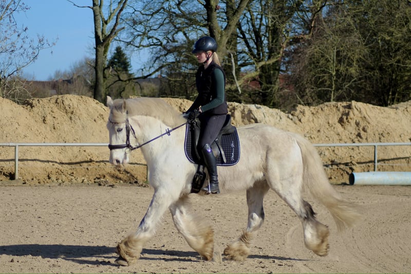 Zum Verkauf steht unser Irish Cob Wallach Mobby. Mit seinen 1,61m deckt er jeden Reiter gut ab, er ist super neugierig und stets motiviert in der täglichen Arbeit. Mobby geht gern ins Gelände-ob mit Sattel, Reitpad oder ganz ohne ! Auch ein paar Baumstämme nimmt er mit Vergnügen mit. Er ist keineswegs eine Schlaftablette! Mit hoher Arbeitsfreude ist Mobby fein zu reiten, sowohl in der Dressur als auch in einem kleinen Parcours ist er fokussiert auf seinen Job. Trotz seiner Motivation ist Mobby immer gut zu Händeln. Im Umgang ist er stets ruhig und kennt keine Unarten. Für ein Probereiten berechnen wir 15€, welche beim Kauf verrechnet werden. Mobby kann bei Bedarf mit Zubehör in sein neues Zuhause ziehen! Wenn sie Fragen oder Interesse haben Mobby kennenzulernen melden sie sich sehr gerne !