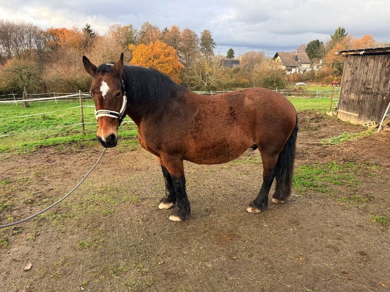 For sale: Stylish Dark Brown French Cob (Cob Normand) – Perfect for leisure riding! We are offering a beautiful Cob mare, born in 2009. With an impressive height of 15.3 hh, she is an elegant companion for all leisure activities. Indoors, she is very well-behaved and calm; in the field, the Thoroughbred influence shows a bit more, making her more spirited (but always manageable). She is said to have been driven, but I cannot confirm this with certainty. We once lunged her, and she performed well. She impresses with her friendly nature and versatility, making her ideal for long rides, as well as a school horse in the arena or on the cross-country course. The mare is healthy, well-trained, and accustomed to human interaction. She is reliable, balanced, and suitable for both experienced riders and ambitious beginners seeking a dependable partner. Currently, she is kept in an open stall and previously was on a large pasture in a herd, so I am unsure if she is suitable for box stall housing. Additionally, she does not like being left alone at all. If interested or for more information, please feel free to contact me. Viewing and trial riding are possible by arrangement.
