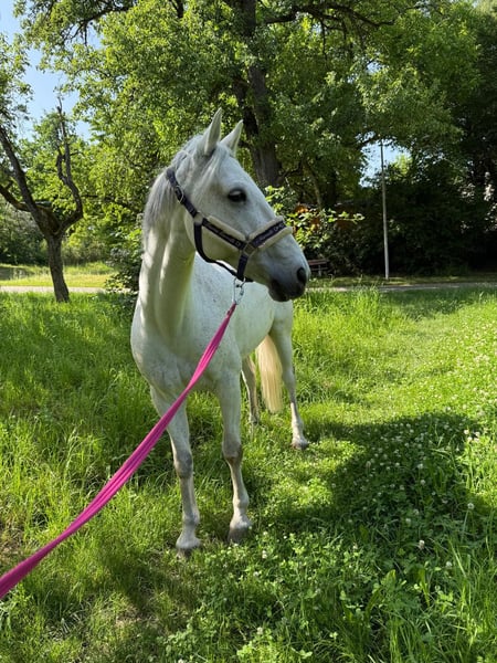 Due to a switch to a larger horse, we are, with a heavy heart, offering our Tom to a suitable new home, provided everything fits: He is an absolute beginner pony: - Grey gelding, 12 years old, 1.46 m (FEI registered) - Show jumping: navigates distances well. Has also been ridden cross-country. - Dressage: can perform some L-level movements (but not at the level or quality of a dressage horse) - Very well-behaved, rather lazy. Suitable for pony riding with small children, etc. - Rides alone and in groups in the terrain. - NOT sold as a sport pony, as he gets very stressed at competitions and sometimes stops. He has taught my niece everything, from first cavaletti to an A-level jumping course. TÜV with photos from 2023 available. VHB €15,000 Complete equipment (Prestige saddle, bridle, leg protection, blankets, etc.) can be purchased together. We are looking for a wonderful family or a child who can learn everything from him and is searching for a little professor. Also happy to consider a mother/child duo. Tom is an honest, reliable fellow with whom you can do everything.