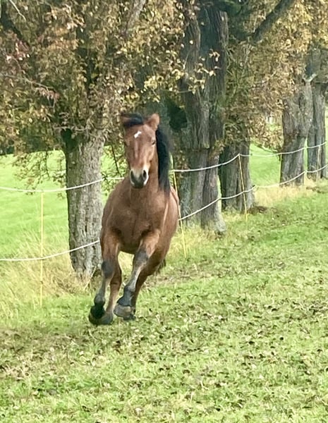 Cinnamon lebt bei uns im Offenstall, ist sehr menschenbezogen, leicht anlongiert, regelmäßig geimpft und entwurmt.