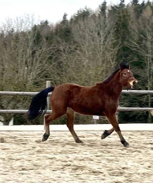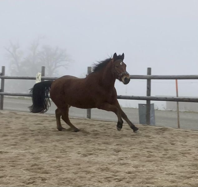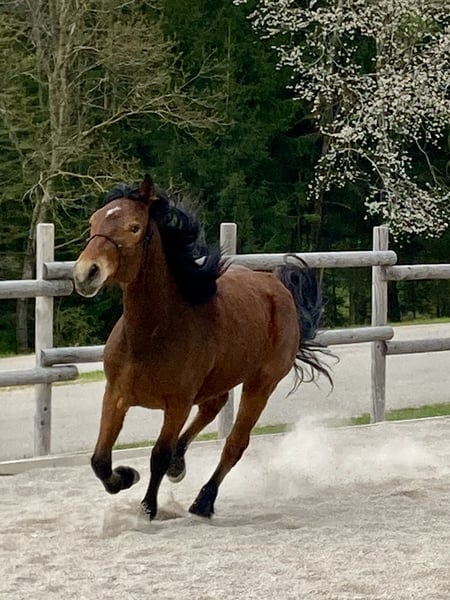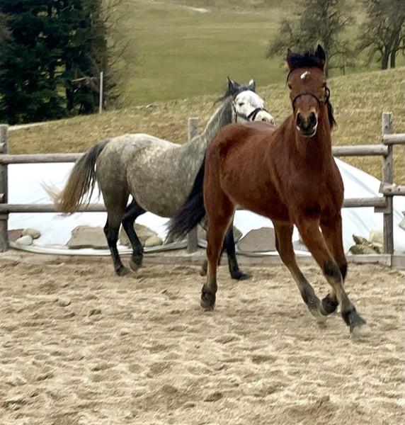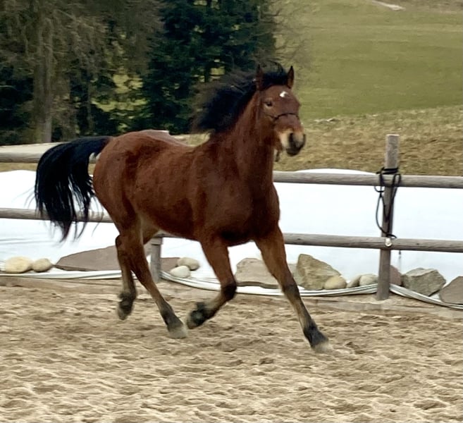 Cinnamon lives with us in an open stable, is very people-oriented, lightly lunged, regularly vaccinated and dewormed.