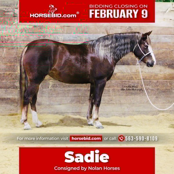 ❤️🔥𝑩𝒆 𝑴𝒊𝒏𝒆 𝐒𝐄𝐋𝐄𝐂𝐓❤️🔥 Happening now thru MONDAY | FEBRUARY 9th - Available EXCLUSIVELY on HorseBid's website! For more details and to register visit: www.Horsebid.com CONSIGNOR CONTACT: Nolan Horses 563-590-8109 LOCATION: Peosta, IA BREED: American Connemara Pony Society REGISTERED: Yes REGISTERED NAME: Wednesday's Etoile De Paris COLOR: Chestnut HEIGHT: 14.2 AGE: 4 GENDER: Mare Sadie is a striking 4-year-old, 14.2 hh chestnut mare registered with the American Connemara Pony Society. She is an exceptional mover with the presence, balance, and substance to excel in the sport-horse world. We purchased Sadie directly from the breeders who raised her from a foal, making us only her second owner. She offers excellent bone, a strong build, and the kind of substance that allows her to go in a variety of directions. Sadie is a correct, balanced mover with natural rhythm and quality gaits. She demonstrates a ground-covering walk, a beautiful, flowing trot, and a balanced lope with easy, correct circles. In the arena, Sadie stands quietly to be mounted, bends softly at the poll, works willingly off leg pressure, stops well, and backs up smoothly. She has been exposed to tarps and has been ridden english and started over small jumps, showing athleticism and a willing attitude. Outside the arena, Sadie has been trail ridden and confidently navigates logs, ditches, hills, and water. She is brave and forward on the trails, going out with confidence and curiosity. She has also been lightly started under harness, further showcasing her versatility. Sadie is a pleasure to handle on the ground. She stands tied all day, is excellent for the veterinarian and farrier, easy to catch, and stands quietly for brushing, saddling, and bridling. She enjoys a bath, is good with fly spray, and is happy either stalled or turned out with other horses. Athletic, versatile, and stylish, Sadie is well suited for a hunter, sport pony, or all-around program. She is a lovely prospect for someone looking to bring along a talented young pony with quality, presence, and a solid foundation. 100% sound.
