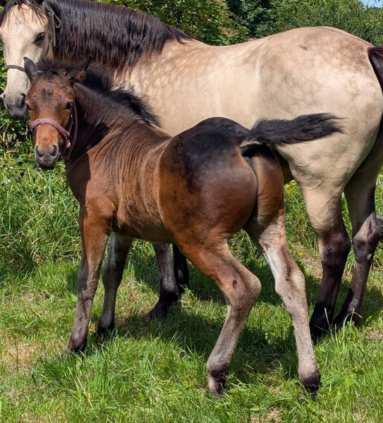 TWINSTAR JJ COLTON rot braun, HWSD: N/N, Fohlenpraemie 8,5 Coolcom JJ x Twinstar Celestine Dun ( Vent D'Er Lann ) Colton ist ein wunderschoenes, typvolles Hengstfohlen mit ueberragenden Bewegungen, viel Knochen und Fundament. Definitiv auch als Hengstanwaerter vorstellbar. Er bleibt mit ca 1,46 - 1,48 im Mass und ist auf der Suche nach seinem neuen 5 Sterne Zuhause. Jungpferde ABC beherrscht er, wird regelmäßig dem Hufpfleger vorgestellt. Wächst mit Gleichaltrigen Kumpels auf den Weiden des Gestüts auf. Drittes Foto aktuelles Bild, der Dunkelbraune Hengst ist sein Vater Coolcom JJ. Fohlenpraemie und ist HWSD: N/N Nähere Infos gern per WhatsApp/Anruf: 0049 160 4052656