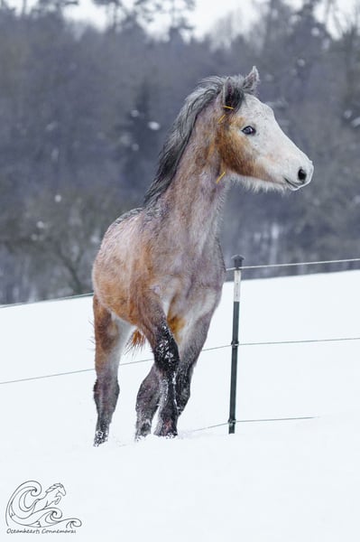 Oceanhearts Ventura is looking for a new home. He loves to please, adores people, and prefers to be right in the middle of the action rather than on the sidelines. Ventura was born and raised within the herd. He has a buddy with whom he enjoys playing and a caring aunt in his current weaning group. He is vaccinated, regularly wormed, chipped, and has good papers from ZfdP. His mother is Muckrim Josie by Westside Mirah, a mare, and his father is Birdmountain van Halen. He is expected to grow into a large, strong pony, likely surpassing pony size. For weaning, Ventura could stay with his buddy, but he will certainly settle quickly into a different group of foals. He is familiar with the basic foal training and always enjoys human contact. He even likes the veterinarian during vaccinations...