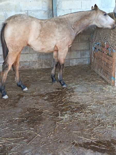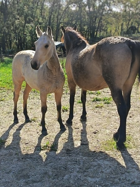 Olympe has found her family, and now it’s the turn of the charismatic Pluie d’Étoiles to find hers! Pluie d’Étoiles is a stunning, full-blooded crème-colored foal with a chocolate coat, born on May 4, 2025. Mother: Calanne des Dieux, a full-blooded, crème-colored, smoky bay mare with PRE origins. Father: Ice Dream One, a full-blooded quarter horse stallion with a cremello coat, approved for breeding, with crème-colored lineage. Expected height around 1.55–1.60 m. Curious, very affectionate, and human-oriented. Calm temperament with just the right amount of blood. Will be a versatile mare suitable for all disciplines: working equitation, flat riding, outdoor riding, TREC, Equifeel, Western, mountain trail, eventing, and even breeding, given her pedigree. Late, gradual weaning planned for early January 2026 (at 8 months), possibly February 2026. Herd-kept. Vaccinated, chipped, dewormed, and under veterinary care. Well-trained and familiar with age-appropriate groundwork (halter-trained, leads, gives feet, lunges). Can be seen with her mother near Toulouse. Transport available upon request. Price: €5,000 including VAT (reservation deposit of €1,000; the remaining balance can be paid in installments until weaning).