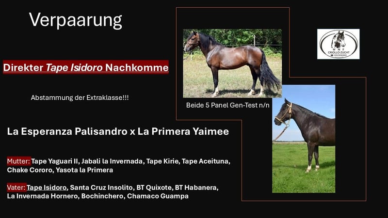 Zum Verkauf steht ein vielversprechender Criollo Hengst, geboren im Jahr 2025. Mit seinem eleganten Grullo-Fell und einem geschätzten Endmaß von ca. 148 cm ist er ein echter Blickfang. Diese Abstammung als direkter Tape Isidoro Enkel mit 5 Panel Gen Test n/n gibt so nur bei WMF Criollo-Zucht. Diese Blutlinie gibt es so nicht mehr !!! Dieser Hengst ist bestens für den Westernsport geeignet und bringt die typischen Eigenschaften seiner Rasse mit: eine hohe Intelligenz, einen ausgeglichenen Charakter und eine große Lernbereitschaft. Er ist gut erzogen und zeigt sich sowohl im Umgang als auch von seinem Nervenkostüm immer von seiner BESTEN Seite. Sein freundliches Wesen macht ihn zu einem idealen Partner für Reiter jeden Alters und Erfahrungsgrades. Ob für Freizeitritte oder als zukünftiger Sportpartner – dieser Criollo Hengst bietet zahlreiche Möglichkeiten. Kann zur weiteren Aufzucht bei uns bleiben. Platz vor Preis Bei Interesse oder für weitere Informationen stehe ich Ihnen gerne zur Verfügung. Lassen Sie sich diese Gelegenheit nicht entgehen, einen so tollen Hengst in Ihre Familie aufzunehmen!