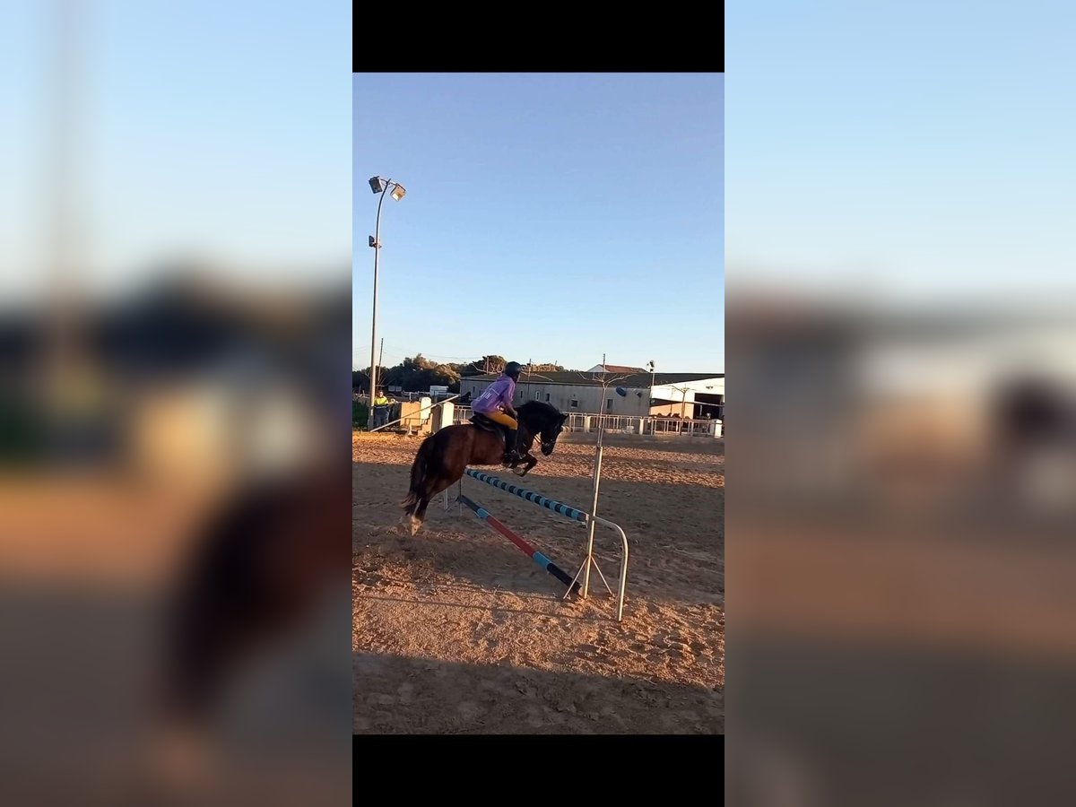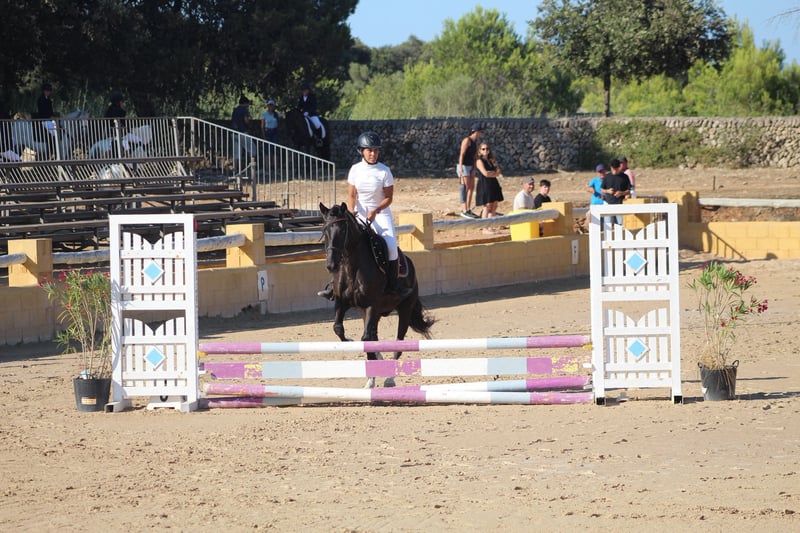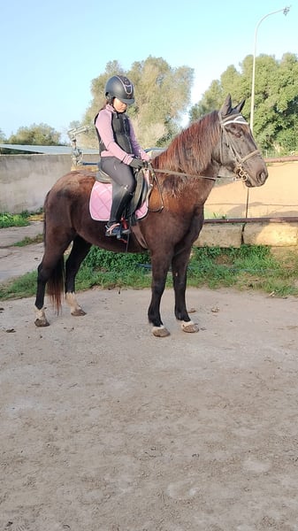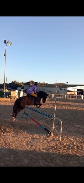 Poni C, con buenas cualidades para el salto, ha estado concursando en 0,60 y 0,70, en casa con recorridos de 0,80/85, y hasta 0,95 en saltos aislados, está trabajando en clases desde hace 10 años. Va sin herrar y nunca ha tenido problemas de lesiones ni cólicos.