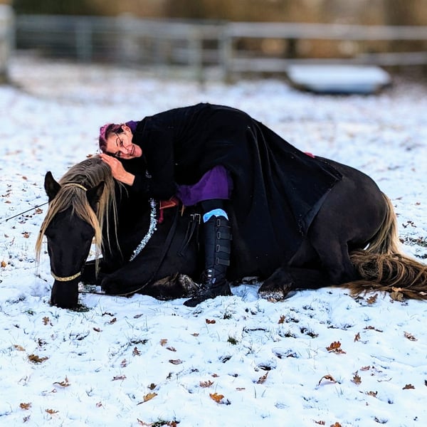 Galaan captivates with his presence and, of course, his striking color. A spirited gelding with a sunny disposition. He learns quickly and enjoys circus tricks and groundwork. In the arena, he moves confidently in all three basic gaits, and his maternal lineage also predisposes him to tölt. Born on June 10, 2016. His sire is a PRE, his dam is a RMH. The pedigrees of both can be seen in the photos. If interested, I can also send more pictures of his dam and sire, as well as photos of Galaan as a foal and young horse. Galaan is an honest horse who can read his rider well. He is very people-oriented once he has bonded, though you need to earn his trust. He can perform Spanish walk, piaffe, lie down, etc., from the ground. He can also fetch. He is highly intelligent and sensitive. Color: windfarben (wind color). Tested negative for PSSM2. Healthy and lively. More of a hippie than a workaholic. With a second horse he trusts, he goes well out on the trail. When alone, he can be cautious and prefers not to go. Walking is no problem. Galaan is a real eye-catcher and a true gem in character. He is part of a gelding herd and is very social and compatible. A special horse for a special rider. !On Instagram under negroplatero, there are more photos and videos of him! Galaan comes directly from his breeder to me and is completely unspoiled in character. He was raised by her, learned the foal basics with love and patience, and was her breeding stallion until she shifted her focus to breeding Arabian Mountains instead of Hispañimountains. Then he came to me. I backed him at age five, not because he was unmanageable, but because I couldn’t provide him with a proper life as a stallion. I am only offering Galaan for sale because he needs a strong rider he can trust. I could tell you a lot about this wonderful horse — it would fill volumes. But if you are the right person for him, I’d be happy to share more. Only WhatsApp! Place before price.