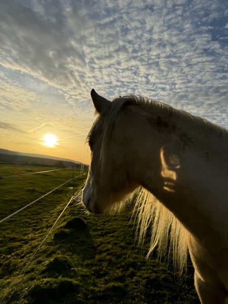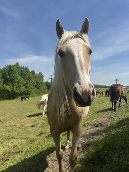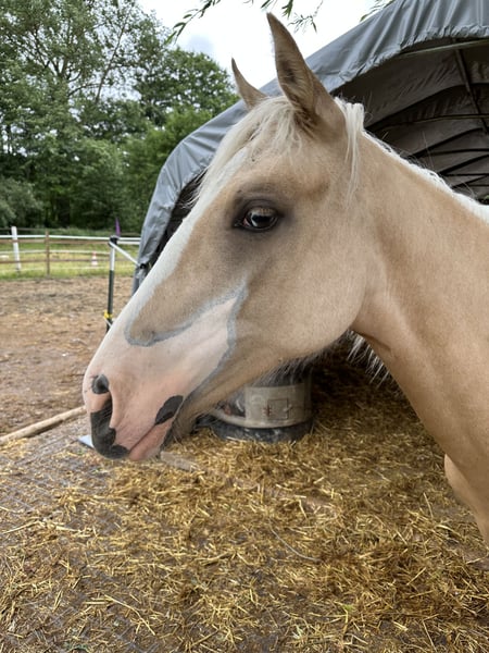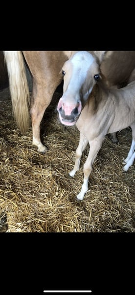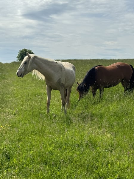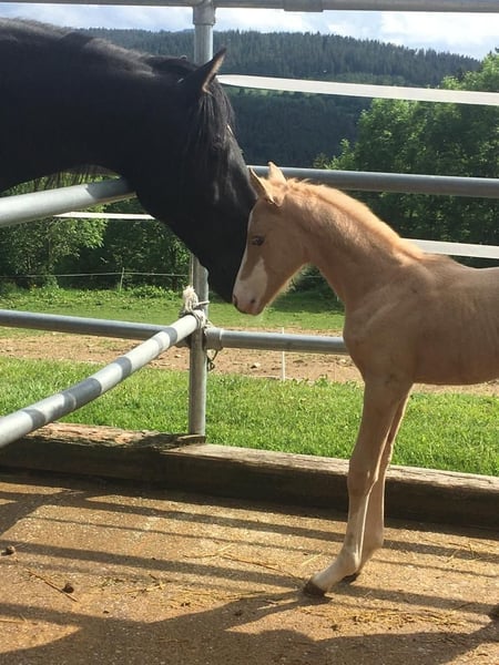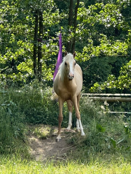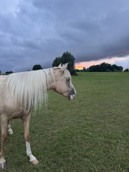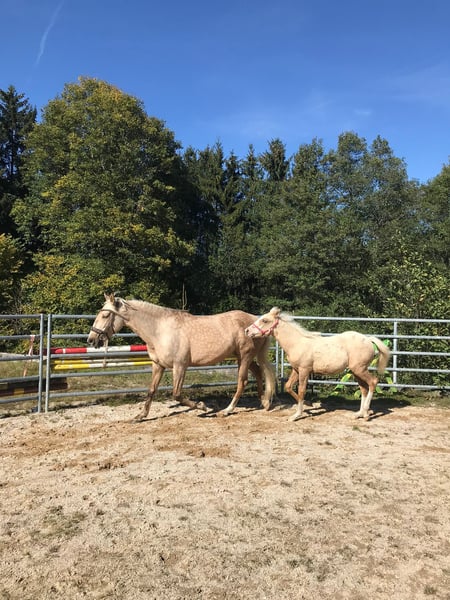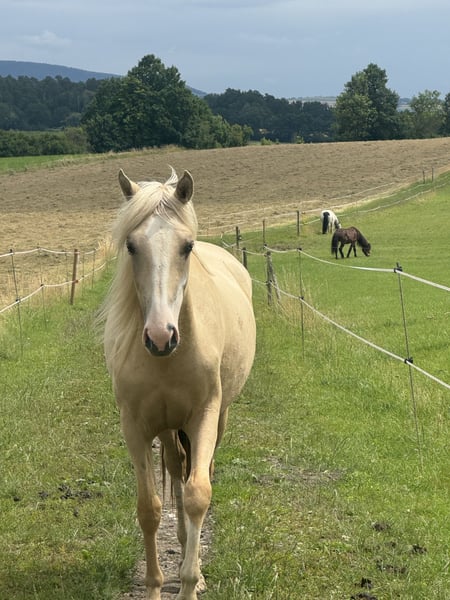 Schweren Herzens habe ich mich aus privaten Gründen und vor allem aufgrund einer Verletzung an meiner Hand dazu entschieden, meine bildschöne 3-jährige Palomino-Stute (Cruzado) abzugeben. Da ich nicht weiß, ob ich mich gesundheitlich jemals wieder richtig um sie kümmern oder sie reiten kann, suche ich nun das bestmögliche Zuhause für sie. Denn sie hat es mehr als verdient. ✨ Über die Stute: • Farbe Palomino mit seltenen zwei verschiedenfarbigen Augen (eins blau, eins braun) • Sehr brav und unkompliziert im Umgang, kennt Führen, Putzen, Hufe geben, Schmied, Hänger fahren, Bodenarbeit und ist absolut lernwillig und wissbegierig. • Von Geburt robust im Offenstall gehalten, in einer Gruppe verschiedensten Alters • Roh, noch nicht angeritten (bewusst so gelassen, Ausbildung sollte erst ab 5 Jahren erfolgen) • Kerngesund (einzig ein Tierarztbesuch wegen leichtem Kotwasser letzten Jahr, vollständig abgeklärt und nachweisbar) • Lernwillig, menschenbezogen, kuschelbedürftig und absolut charakterstark – ein echtes Herzenspferd mit dem dem man sicher durch dick und dünn gehen kann Wichtige Bedingungen: • Sie wird ausschließlich in pferdegerechte Haltung abgegeben – keine Boxenhaltung, da sie das nicht kennt! • Es wird ein detaillierter Kaufvertrag abgeschlossen, u. a. mit Vorkaufsrecht, Vertragsstrafen etc., damit ich sicherstellen kann, dass sie auch langfristig in guten Händen bleibt und nicht zum Wanderpokal wird. • Mir ist sehr wichtig, dass sie einen Platz findet, wo Zeit, Erfahrung und vor allem Herz vorhanden sind. Sie hat keine direkten Papiere, nur einen Pass. Der Vater ist unbekannt. Die Mutter kam bereits Trächtig von Spanien nach Deutschland. Die Mutter ist auch eine wunderschöne Palomino Stute und Herzenspferd. Mutter hat ein Stockmaß von circa 1,53, man geht bei ihr daher von einem geschätzten Endmaß von ca. 1,60 aus. Bilder mit der Mutter sind in der Anzeige am Ende vorhanden. Preisvorstellung: 6000 € VB ❗️ KEIN NOTVERKAUF ❗️ Standort: Nähe 95326 Kulmbach Nur an verantwortungsbewusste und liebevolle Menschen abzugeben. Keine Händler. Keine Schulbetriebe! Bitte nur seriöse Anfragen – sie bedeutet mir sehr viel, daher steht ihr Wohl an erster Stelle. Preis ist verhandelbar, das perfekte Zuhause ist am wichtigsten. Möglichkeit der Ratenzahlung besteht, mit 50% Anzahlung des Kaufpreises und Herausgabe erst bei vollständiger Bezahlung. Bis zur vollständigen Bezahlung müssten dann auch sämtliche Kosten vom Käufer übernommen werden (Stall, Tierarzt, Versicherungen, Hufschmied etc.)