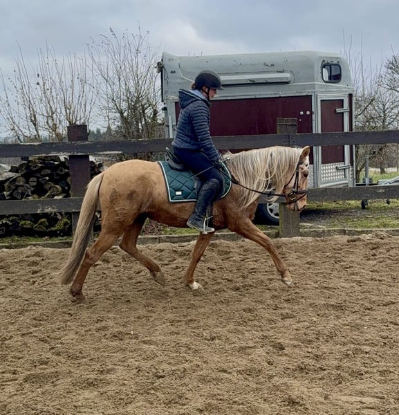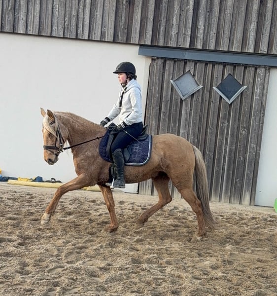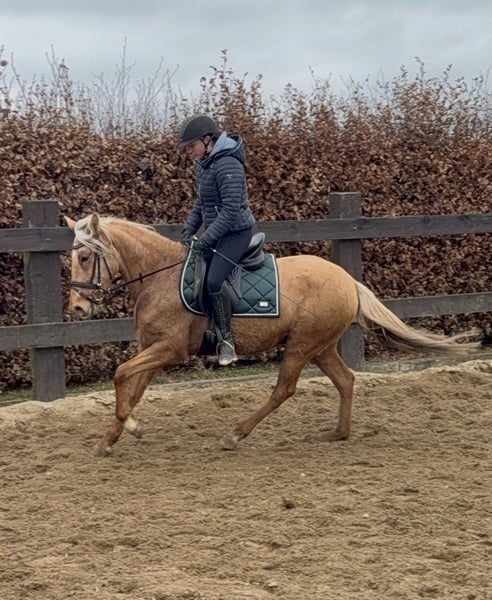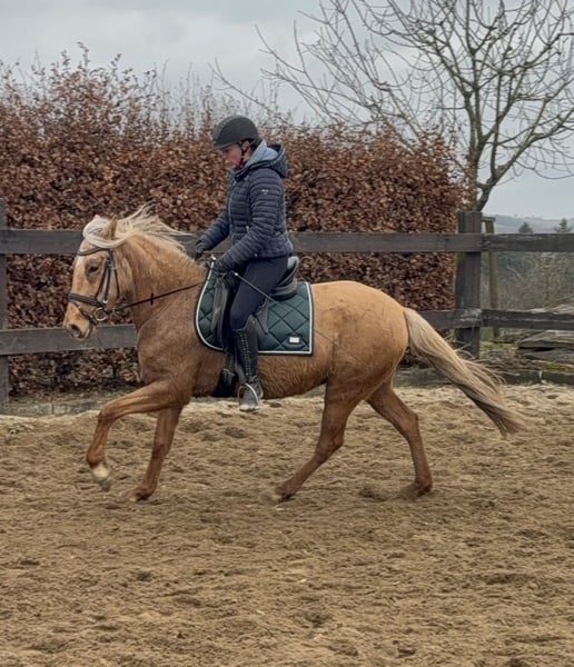Zum Verkauf steht eine 4,5 Jahre alte, etwa 151cm große Stute in der tollen Farbe Dunalino ohne Abstammung. Sie ist gut freizeitmäßig geritten und zeigt sich sehr talentiert bei der dressurmäßigen Arbeit auf dem Reitplatz. Kleine Sprünge meistert sie auch ohne Probleme. Dies kann natürlich noch weitere ausgebaut werden. Sie zeigt keine Unarten unter dem Sattel und ist ziemlich einfach zu reiten. Daher wäre sie bestimmt auch für eine Reitschule interessant. Im Umgang ist sie ebenfalls absolut unkompliziert und brav. Sie lebt bei uns im Offenstall und ist sehr verträglich auch in der gemischten Herde. Sie kann robust gehalten werden, kennt aber auch die Box. Krankheiten oder Allergien sind nicht bekannt. Eine AKU darf gerne gemacht werden. Für das Probereiten, Vorreiten oder anderes Ausprobieren des Pferdes berechnen wir 35€. Beim Kauf wird dies gutgeschrieben. Gerne anrufen oder eine Nachricht senden 0157 36803742 Alle Angaben ohne Gewähr, Preisänderungen vorbehalten, Transport möglich, Onlinekauf möglich