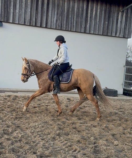 For sale is a 4.5-year-old mare, approximately 15.1 hh, in the beautiful Dunalino color with no pedigree information. She has been well-schooled in leisure riding and demonstrates great talent in dressage work in the riding arena. She also handles small jumps without any issues, and this aspect can be further developed. She shows no bad habits under saddle and is quite easy to ride, making her suitable even for riding schools. In handling, she is very straightforward and well-behaved. She lives in an open stable and gets along well with other horses in a mixed herd. She can be kept robustly but is also familiar with box stall housing. No health issues or allergies are known. An ultrasound examination (AKU) can be performed upon request. A trial ride, pre-ride, or other testing of the horse costs €35, which will be credited towards the purchase if the deal is finalized. Please call or send a message to 0157 36803742. All information provided is without guarantee. Price may be subject to change. Transport is possible, and online purchase is available.