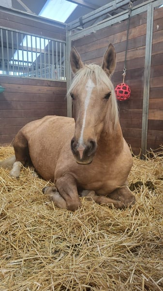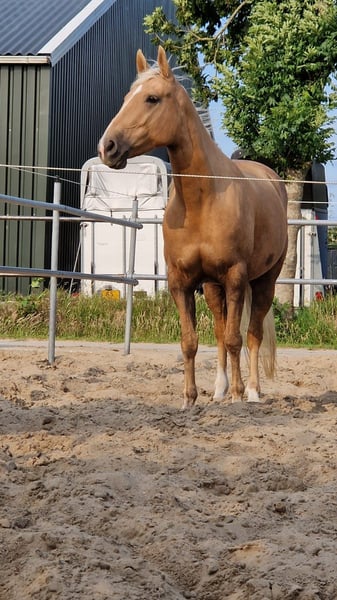 Te koop: Lieve en talentvolle merrie Amber 🌸 Na lang wikken en wegen toch besloten om lieve Amber te verkopen. Amber is een 6-jarige merrie, een prachtige kruising tussen een Lusitano en een Quarter Horse, met een schofthoogte van 1.51m. Amber is een echte knuffelkont met een zacht karakter. Ze is sociaal in de kudde en eerder wat onderdanig dan dominant. Ze houdt van aandacht, geniet enorm van een uitgebreide poetsbeurt en knuffels zijn helemaal haar ding. Onder het zadel is Amber goed aan de hulpen en eerder wat voorwaarts ingesteld. Ze is nu ruim anderhalf jaar onder het zadel en pakt nieuw werk snel op. Ze moet nog verder worden doorgereden, maar toont duidelijk potentie voor de sport. Balkjes en springen vindt ze geweldig, ze wordt daar zichtbaar enthousiast van en doet dit met veel plezier. Haar balans is nog in ontwikkeling, maar dat is gezien haar leeftijd logisch. Amber kent ook grondwerk, longeren en werken aan de dubbele lijnen. Ze gaat graag mee naar buiten, maar heeft daar wel een zekere ruiter bij nodig. Als ze iets spannend vindt, kijkt ze even of stopt ze kort, maar met rust en vertrouwen van de ruiter gaat ze er keurig langs en dan straalt ze van trots. Verder is Amber heel braaf in de omgang: • Ze loopt zo de trailer op • Is keurig bij de hoefsmid en tandarts • Recent bekapt, geënt en naar de tandarts geweest • Staat niet op ijzers Afgelopen zomer heeft ze 24/7 buiten gestaan in kuddeverband. Momenteel staat ze op stal en gaat ze twee keer per dag met een maatje naar de paddock. Amber is een ontzettend fijn paard voor iemand die verder met haar aan de slag wil gaan en samen wil groeien. Ze is niet geschikt voor een beginnende ruiter, maar voor iemand met wat ervaring zal ze een heerlijke en betrouwbaar maatje worden eentje met een gouden karakter en een hart van goud. 💛