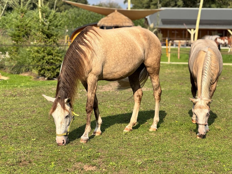 🍏🍎 APPLE 🍎🍏 Ben jij opzoek naar een veelzijdig paard, die haar looks mee heeft, en jou wat uitdaging biedt in het rijden? Dan lees vooral even verder! Apple is een 7 jarige merrie die al 1 prachtige gezonde veulen op de wereld heeft mogen zetten. Op haar paspoort wordt ze omschreven als een cruzado, maar wij denken dat er ook wat Quarter bloed in haar zit. Apple is 1,5 jaar geleden getraind door Trudy Vd Plas, waarna zij in de manege lessen zou gaan lopen. Helaas was dit geen succes in verband met haar onzekere karakter. En staat ze nu weer terug bij Trudy van der Plas in Boekel om het juiste huisje voor haar te vinden. Apple heeft behoefte aan 1 ruiter, die weet wat ze wilt, zodat Apple daar in kan volgen. Dat betekent absoluut niet dat ze gevaarlijk is of wat dan ook, sterkter nog; het is een paard wat nooit zal schrikken. In de bossen vindt ze het dan ook het leukste! Is 1000% verkeersmak maar in de bak heeft ze gewoon een duidelijke hand nodig. In de omgang is ze lief, aanhankelijk en eerlijk, maar ook sensibel. Apple hecht zich sterk aan één persoon en bloeit op bij vertrouwen en consequentheid. Zodra ze die klik voelt, gaat ze helemaal voor je. - Spaanse mix merrie - Geboren: 01-04-2019 - Hoogte: om en nabij 1.55 m - Lief, sensibel en trouw karakter - Niet geschikt voor beginners - Ben jij die ervaren ruiter die haar met rust, vertrouwen en liefde verder wil begeleiden? Ben jij die ruiter? Neem dan snel contact met een van ons voor het maken van een afspraak of om video's op te vragen. Apple is altijd netjes geënt, ontwormd etc. En kent geen gebreken. Keuren door een eigen dierenarts is toegestaan K.K.